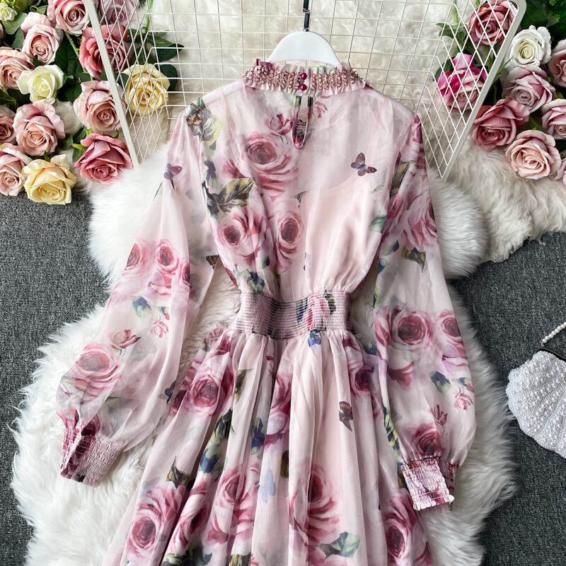 ワンピース レディース フレアワンピース ミドル丈 袖あり 長袖 スタンドカラー 襟つき スリム フレア 細身 シースルー 透け感 ハイウエスト キャミソール かわいい 大人可愛い きれいめ 大人 上品 ラブリー キュート おしゃれ 大人女子 こなれ感 エレガント 結婚式 二次会 披露宴 10代 20代 30代 OL 通勤 学生 通学 デート お出かけ 女子会 パーティー イベント リゾート 韓国系 オルチャン ファッション コーデ スタイル モテ 体系カバー 美脚 脚長 インスタ映え ピンク 花柄