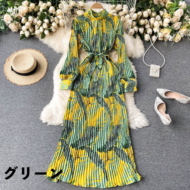 ロングワンピース ドレス パフスリーブ レトロ スタンドカラー ロング丈 長袖 プリーツ レディース 10代 20代 30代 40代 50代 ワンサイズ 全6色 ブラック イエロー グリーン アプリコット レッド カーキ 柄 主役級 ハイセンス アート 個性的 大人女子 大人カワイイ 上品 おしゃれ お洒落 存在感 春 秋 冬 インスタ映え 通学 お出かけ 休日 ヌケ感 とろみ感 透け感 韓国 韓国系 オルチャン アフタヌーンティー ヌン活 柄違い エレガント 美術館 デート パーティ イベント 花柄