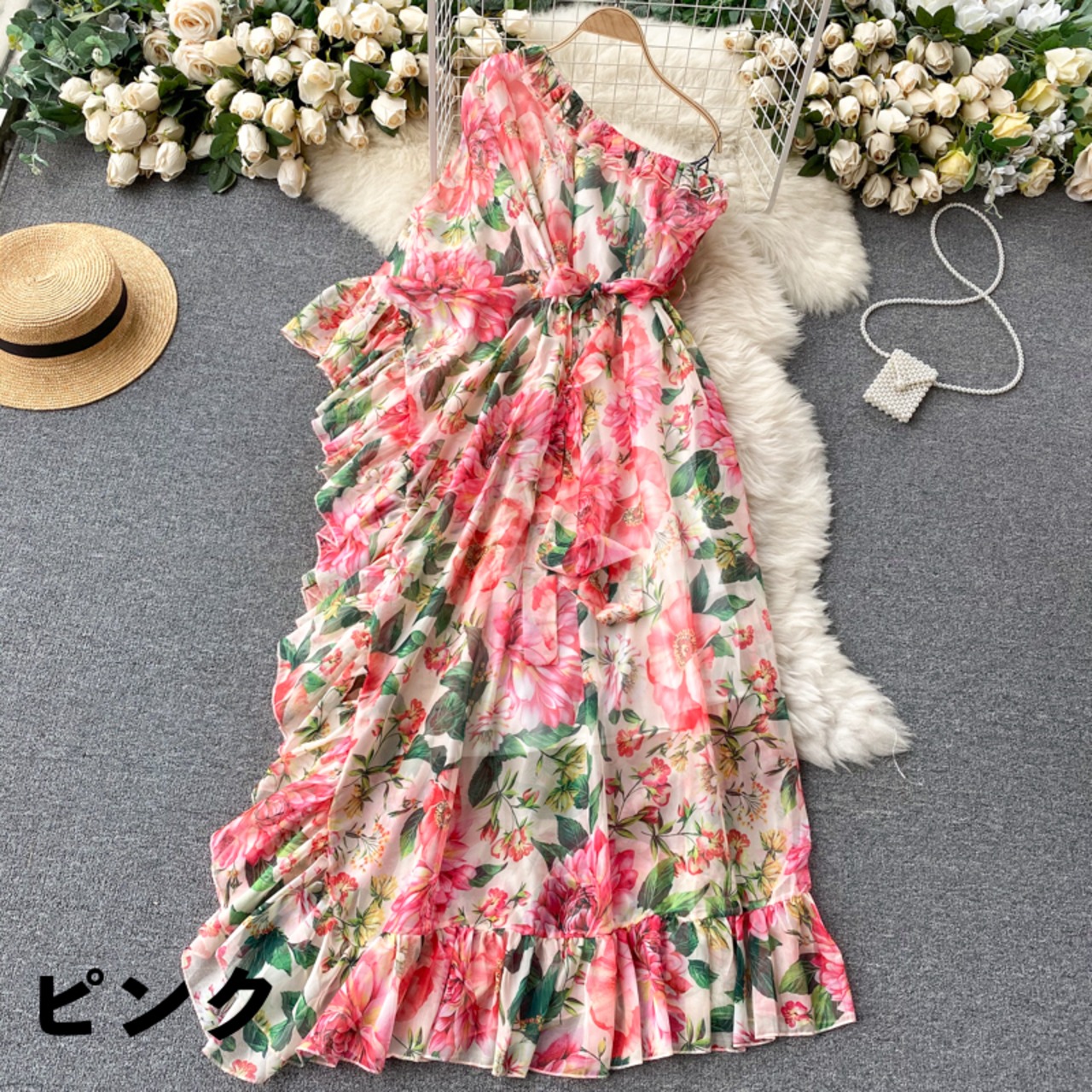 ロングワンピース ドレス フリル 肩出し 花柄 ボタニカル フラワー レトロ アシンメトリー 斜め襟 ロング丈 長袖 レディース 10代 20代 30代 40代 50代 全2色 ピンク 桃色 グリーン 緑 主役級 ハイセンス 個性的 大人女子 大人カワイイ おしゃれ お洒落 存在感 派手 春 夏 秋 冬 オールシーズン インスタ映え イベント ひらひら 透け感 とろみ感 休日 リゾート パーティ 韓国風 オルチャン エレガント リゾート 海 特別 大きいサイズ 体型カバー 女子会 海外 二次会 結婚式