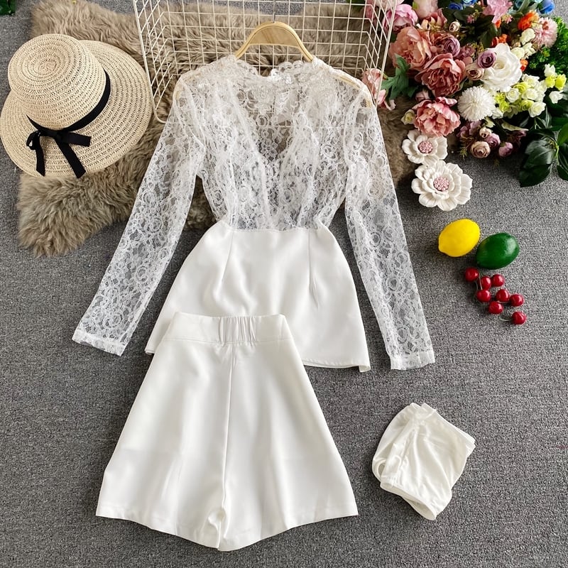セットアップ レディース 3点セット トップス ブラウス ペプラム前開き 袖あり 長袖 襟つき スタンドカラー Vネック レース 透け感 キュロット ミモレ丈 ショーツ スリム 細身 かわいい 大人可愛い きれいめ 大人 おしゃれ 大人女子 こなれ感 セクシー エレガント 10代 20代 30代 OL 通勤 学生 通学 デート お出かけ 女子会 パーティー イベント リゾート 着回し 普段使い 重ね着 韓国系 オルチャン ファッション コーデ スタイル 楽ちん モテ インスタ映え ホワイト ブラック 無地