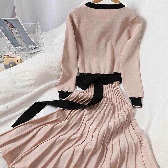 秋 冬 ニットワンピース ワンピ ワンピースドレス 人気 レトロ レディースファッション モダン 普段着 普段使い 着回し おしゃれ女子 オシャレ オトナモード クール スタイリッシュ パーティー お呼ばれ 二次会 飲み会 合コン 女子会 素敵 ワンサイズ ブラック アプリコット パープル 新作 オールマッチ ラウンドネック ボタン 秋冬ニットワンピース 3カラー 韓国 オルチャン 韓国デザイン 海外ファッション インスタ 映える ウエストプリーツ ロングスカート リボンフリル ベルト付きドレス モテ