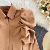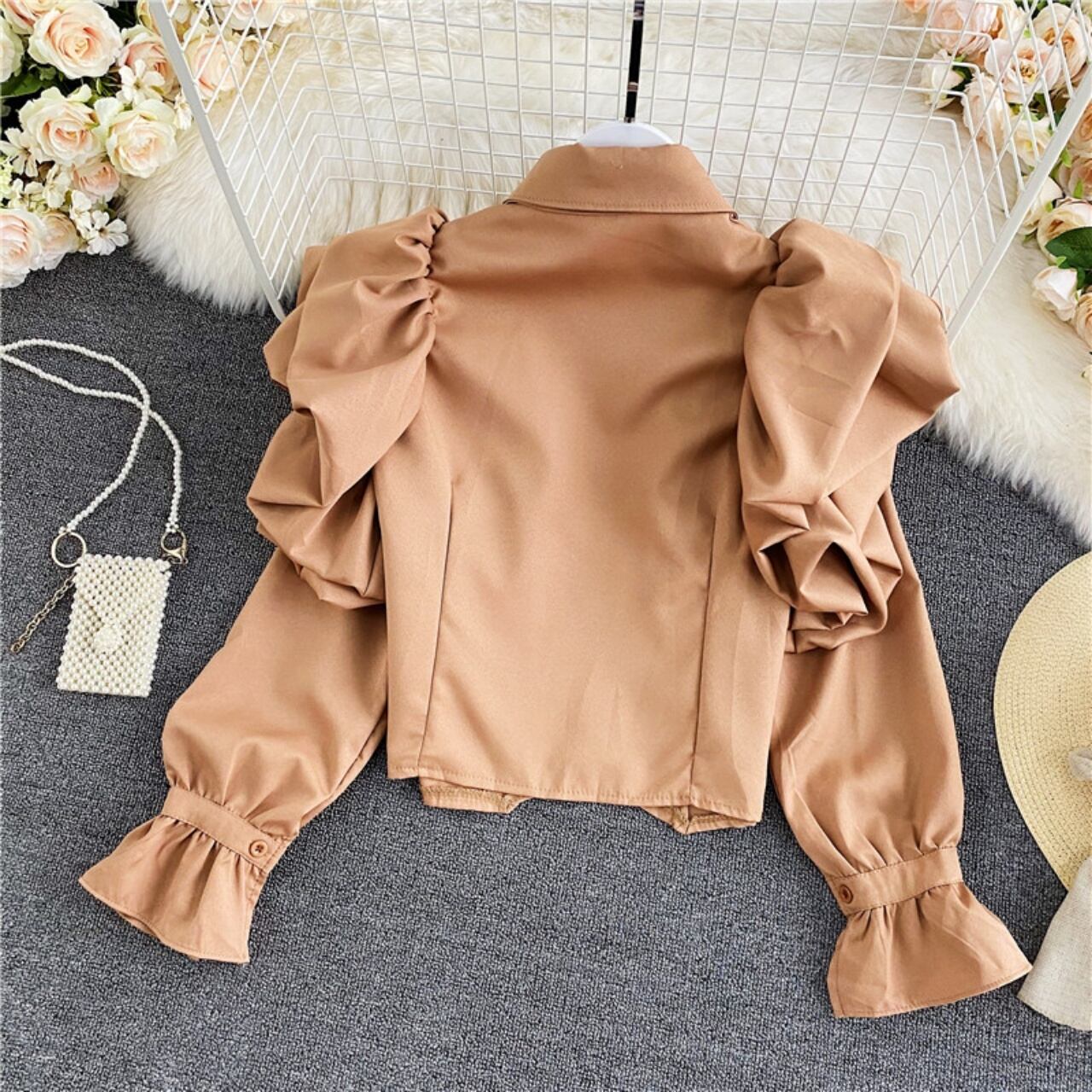 シャツ レディース トップス ブラウス 前開き ボタン 襟付き バブルスリーブ 袖フリル 長袖 ストラップカフス 大人可愛い かわいい きれいめ シンプル エレガント 上品 フォーマル オシャレ お洒落 シック クラシカル レトロ クール ワンサイズ 3カラー ベーシックカラー 学生 通学 OL 通勤 ママ オケージョン ミセス セレモニー 休日 お出かけ デート 食事会 女子会 イベント パーティー 着回し 普段使い ファッション 簡単コーデ スタイル デザイン おすすめ 人気 トレンド モテ