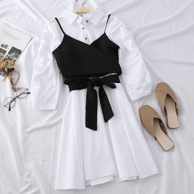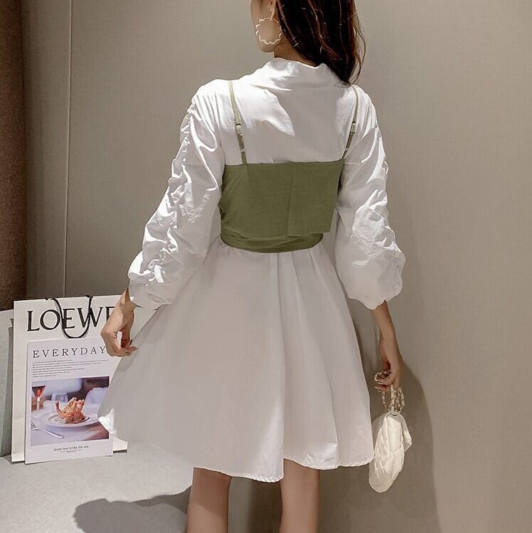 ブラウス シャツ ベスト ドッキング セット セットベスト 秋冬ファッション 秋冬物 トレンド トレンディ シンプル 流行 婦人服 今風 ドレス女性 新しい チューブトップス トラップ ミドル丈シャツ ツーピース ウエスタンスーツ スカート 新しい 新作スタイル ショートストラップ チューブトップス トラップ ミディアム ロング 無地 長袖シャツ ドレス ツーピース スーツ シャツ風ワンピース M L ブラック グリーン カーキ カジュアル 普段着 普段使い 着回し レディースファッション レディース