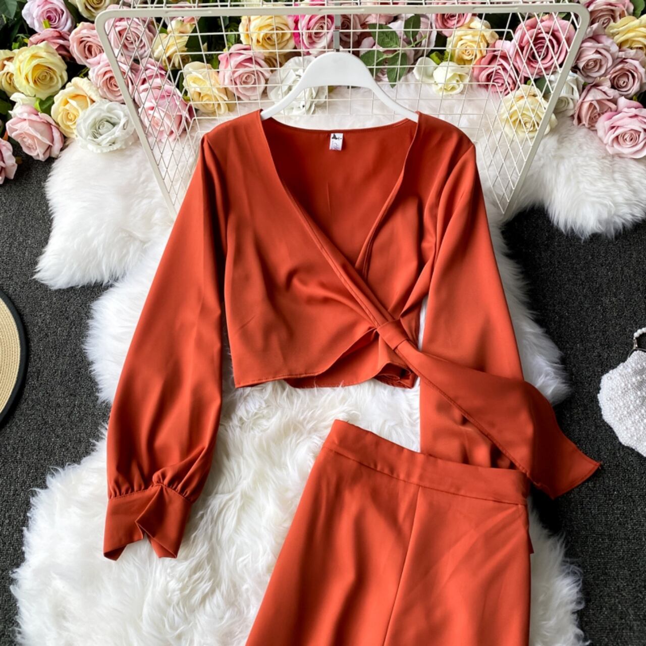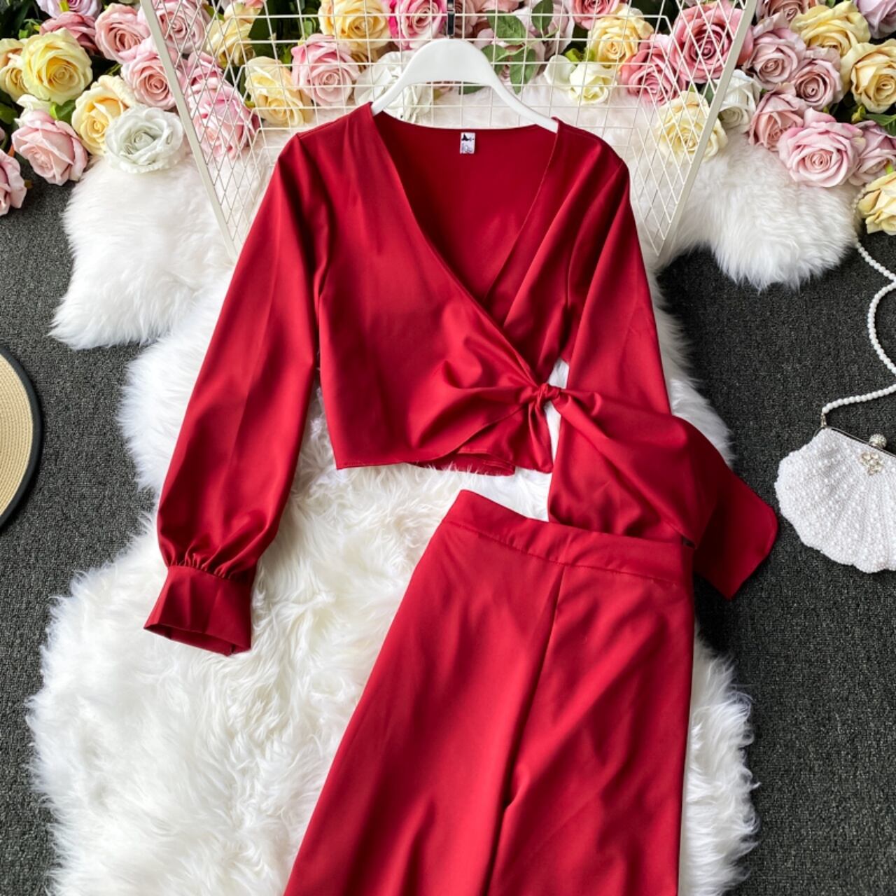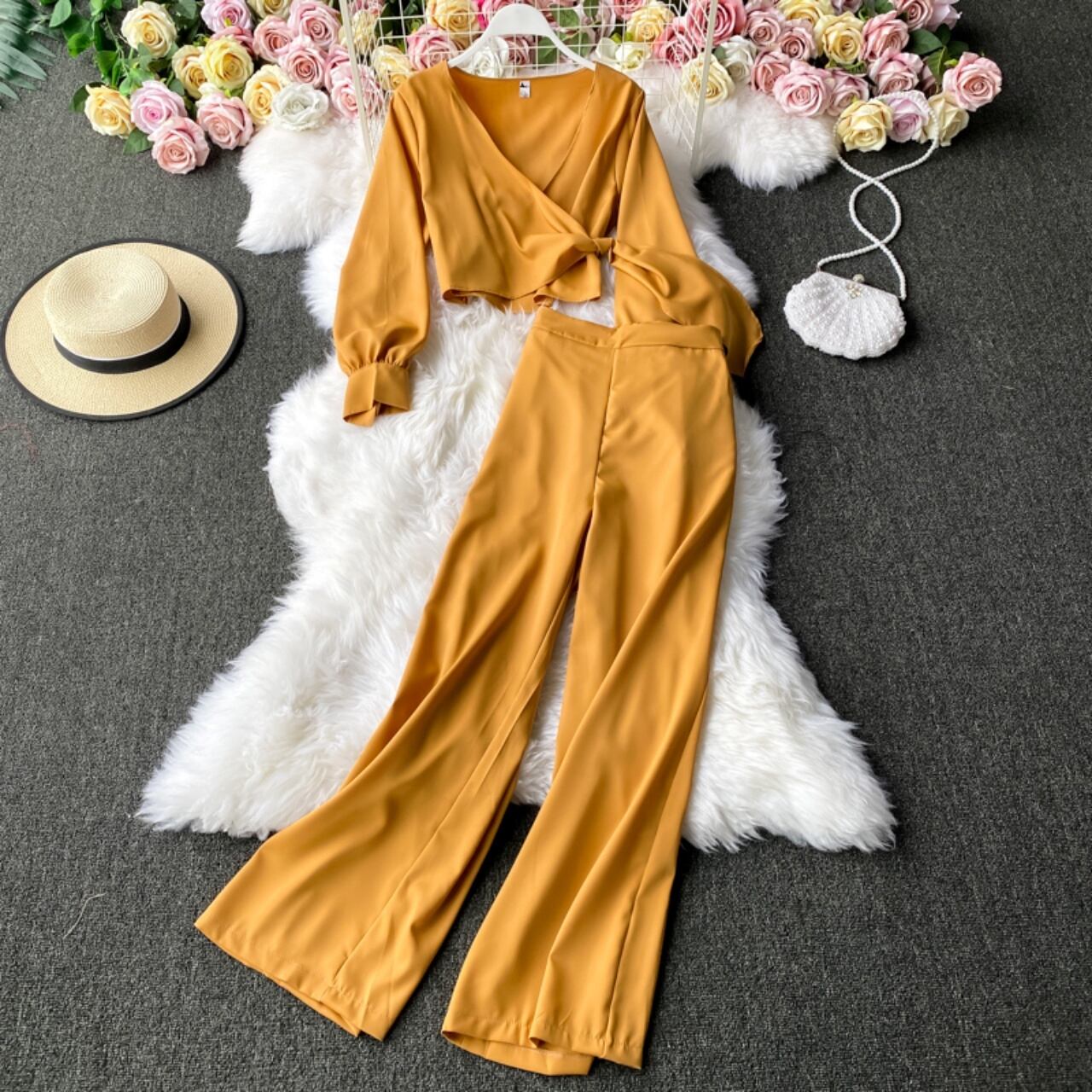 カシュクールのデザインが目を惹くトップスとゆるめのシルエットのセットアップ