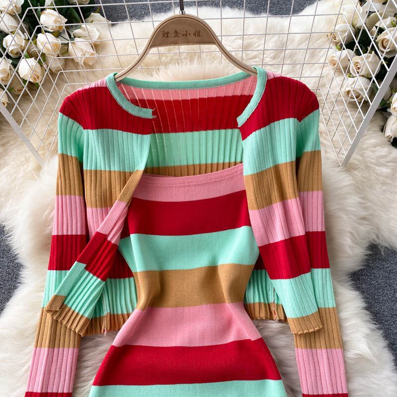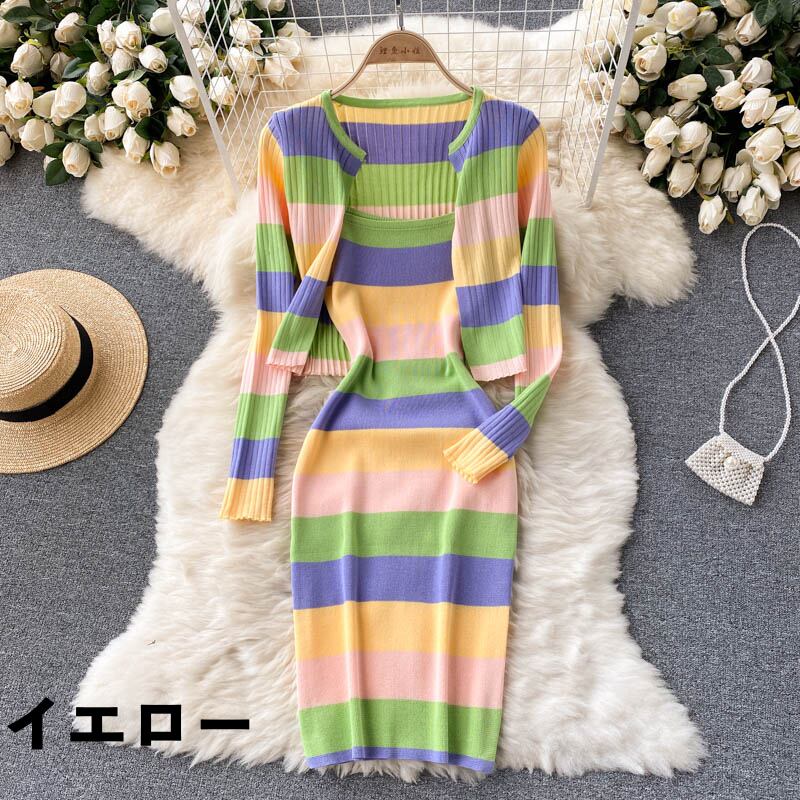 ニット カーディガン ワンピース キャミワンピ スーツ セットアップ ツーピース 長袖ラウンドネック レディース 全3色 レッド 赤 イエロー 黄色 ブルー 青 ボーダー ストライプ レディース 高見え こなれ感 タイト Aライン ミドル丈スカート 韓国 韓国風 オルチャン 大人女子 大人可愛い ヌン活 お揃い 双子 色違い 普段着 デート 女子会 美脚 脚長 インスタ映え おしゃれ お洒落 スタイルアップ 個性的 派手 パーティー 休日 イベント 着回し 10代 20代 30代 40代 お出かけ 旅行
