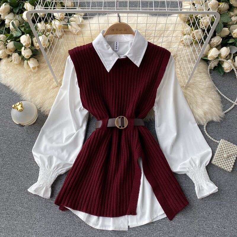 ニットベスト ブラウス シャツ ランタンスリーブ スリット ウエストベルト スーツ襟 トップス ツーピース 2点セット 全5色 ブラック 黒 ブラウン 茶色 レッド 赤 グレー 灰色 アプリコット 肌色 ベージュ 高見え レディース ラウンドネック 無地 エレガント 上品 二次会 パーティー お洒落 カワイイ 大人可愛い 大人女子10代 20代 30代 40代 50代 韓国 韓国風 オルチャン 主役級 インスタ映え デート お出かけ 春 秋 冬 休日 モテ 双子 色違い 普段着 ランチ 長袖 ヌン活