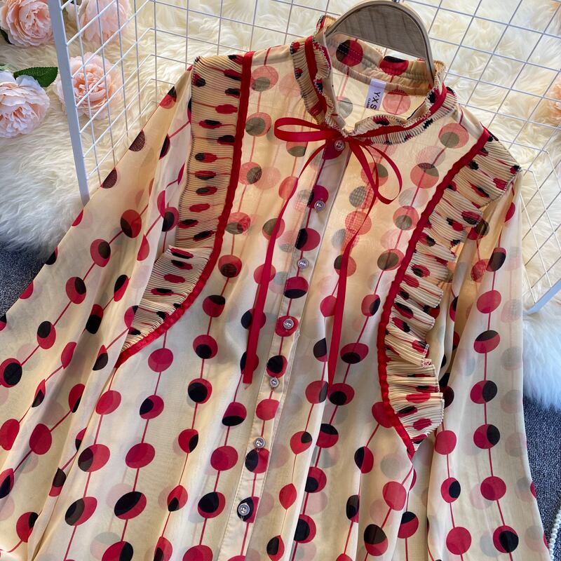 シフォン ブラウス シャツ ランタンスリーブ スタンドカラー パフスリーブ リボンタイ トップス 全3色 ネイビー グリーン アプリコット ドット 水玉 レディース お洒落 カワイイ 大人可愛い 大人女子10代 20代 30代 40代 50代 韓国 韓国風 オルチャン 主役級 インスタ映え デート お出かけ 春 秋 冬 休日 モテ 双子 色違い 普段着 ランチ 長袖 ヌン活 上品 柄物 透け感 ヌケ感 フリル 個性的 ハイセンス ボタン 前開き 公園デビュー 着回し 重ね着 OL 通勤 通学 学生 色違い