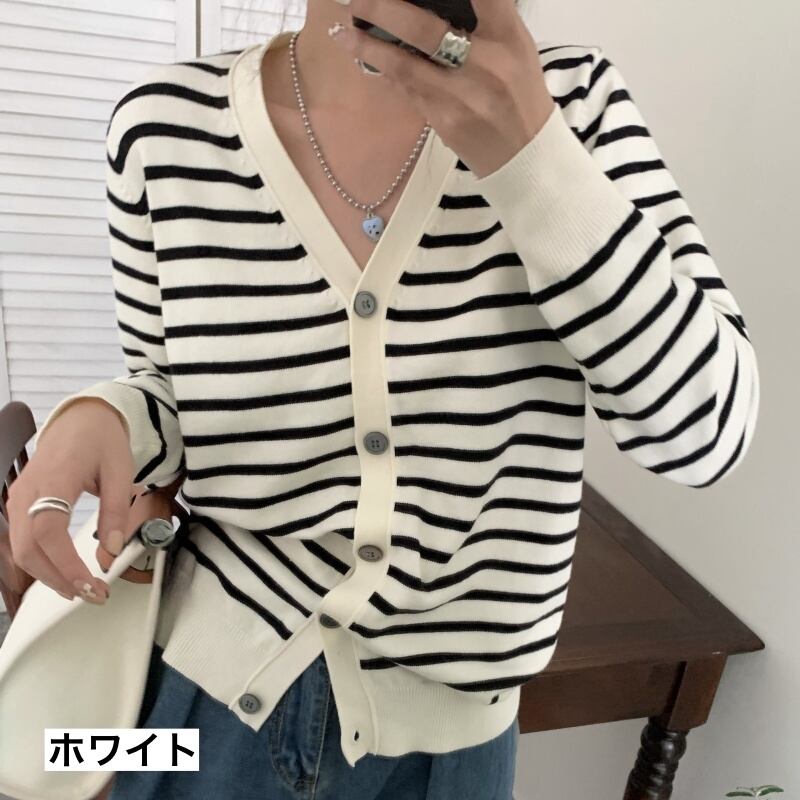 トップス レディース カーディガン 長袖 柄 ボーダー 春 細身 ストレート かわいい 大人可愛い きれいめ シンプル カジュアル 大人 上品 おしゃれ お洒落 大人可愛い 大人女子 キュート 個性的 Vネック 袖あり 白 ホワイト 黒 ブラック 大人カラー ワンサイズ 20代 30代 40代 オフィス ビジネス OL 通勤 学生 通学 デート お出かけ 女子会 休日 着回し 普段使い 重ね着 韓国 韓国系 オルチャン ファッション コーデ スタイル モテ トレンド 流行 インスタ映え