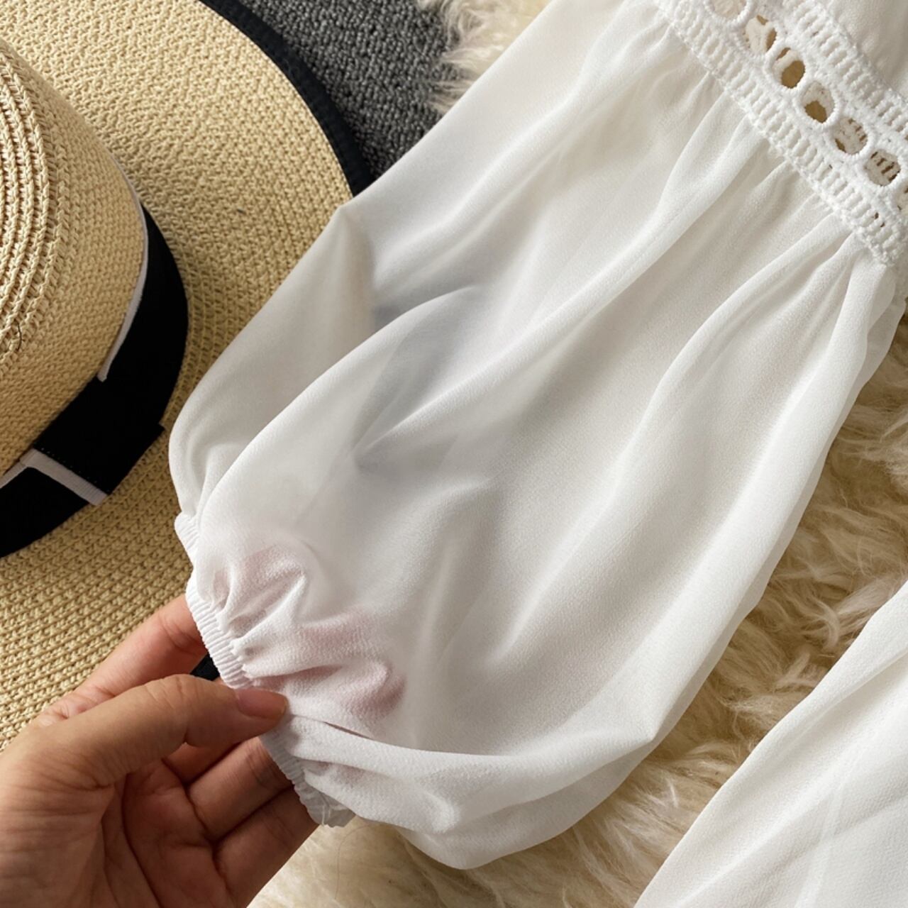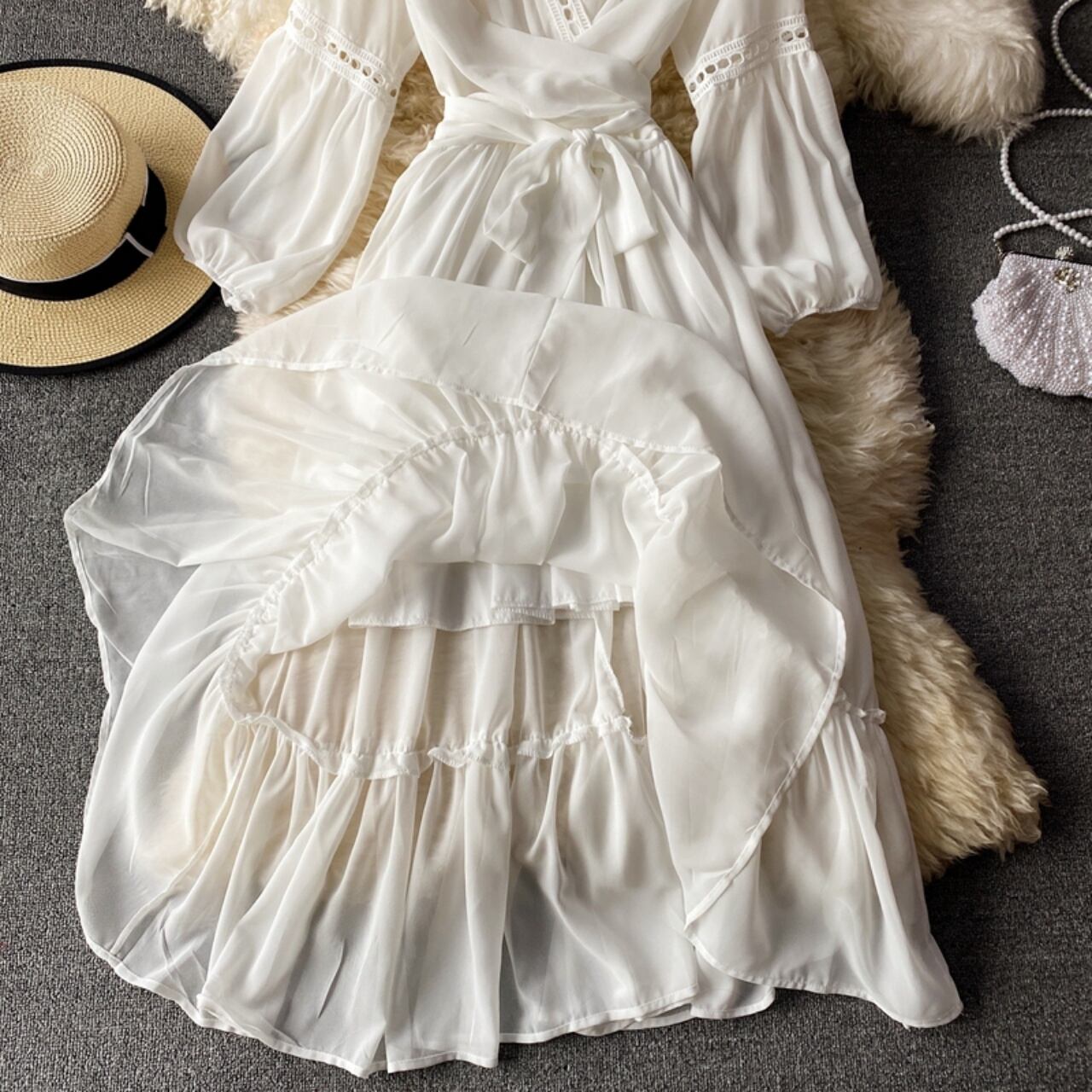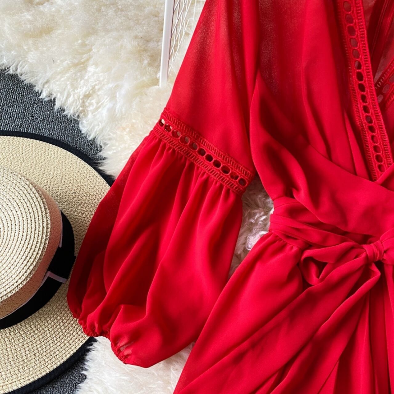 ワンピース レディース ドレス シースルーVネック カシュクール 長袖 ボリューム袖 ハイウエスト切替 リボン Aライン 裾フレア ティアード 膝下 ロング丈 裏地 バックファスナー 透け感 大人女子 きれいめ 清楚 大人 エレガント フォーマル 大人可愛い かわいい シック オシャレ 上品 キュート 2サイズ 2カラー レッド ホワイト 無地 10代 20代 30代 結婚式 披露宴 二次会 謝恩会 セレモニー 海外挙式 重ね着 ファッション コーデ スタイルアップ 楽ちん 体型カバー 美脚 脚長 モテ