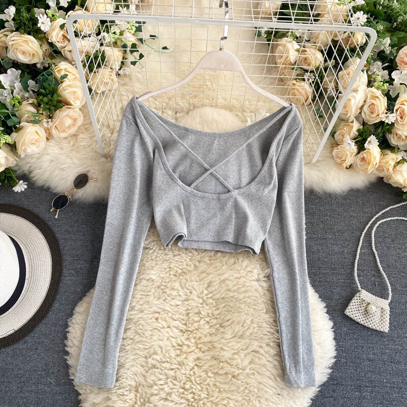 セクシー 背中開き トップス 長袖 ゆるネック ラウンドネック スリム バックレス タイト ショート ミニ丈 ライトグレー 灰色 ブラック 黒 ダークグレー レディース 薄手 ハイウエスト お洒落 大人可愛い 大人女子 10代 20代 30代 40代 50代 韓国 韓国風 オルチャン 主役級 インスタ映え デート お出かけ 春 秋 冬 休日 普段着 エレガント フォーマル きれいめ デコルテ 着回し 重ね着 シンプル 無地 オールマイティ 運動 OL 通勤 通学 リゾート 旅行 カジュアル かっこいい