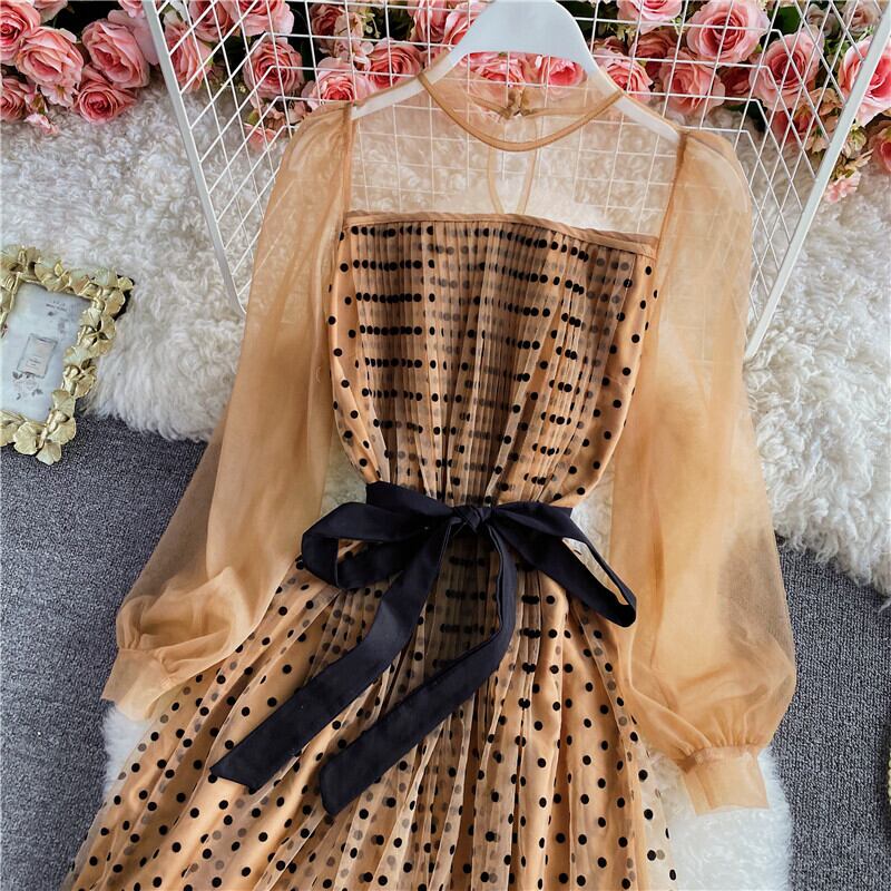 ワンピース レディース Aラインワンピース シフォンワンピース ミモレ丈 長袖 柄 ドット 水玉 春 秋 セミフレア Aライン 透け感 シースルー 伸縮性 かわいい 大人可愛い きれいめ シンプル カジュアル 大人 上品 おしゃれ お洒落 大人可愛い 大人女子 ラブリー キュート ガーリー 個性的 フォーマル 抜け感 クルーネック ミモレ 袖あり くすみカラー 大人カラー S M L 20代 30代 お出かけ 女子会 休日 パーティー コーデ スタイル モテ プチプラ トレンド 流行 インスタ映え