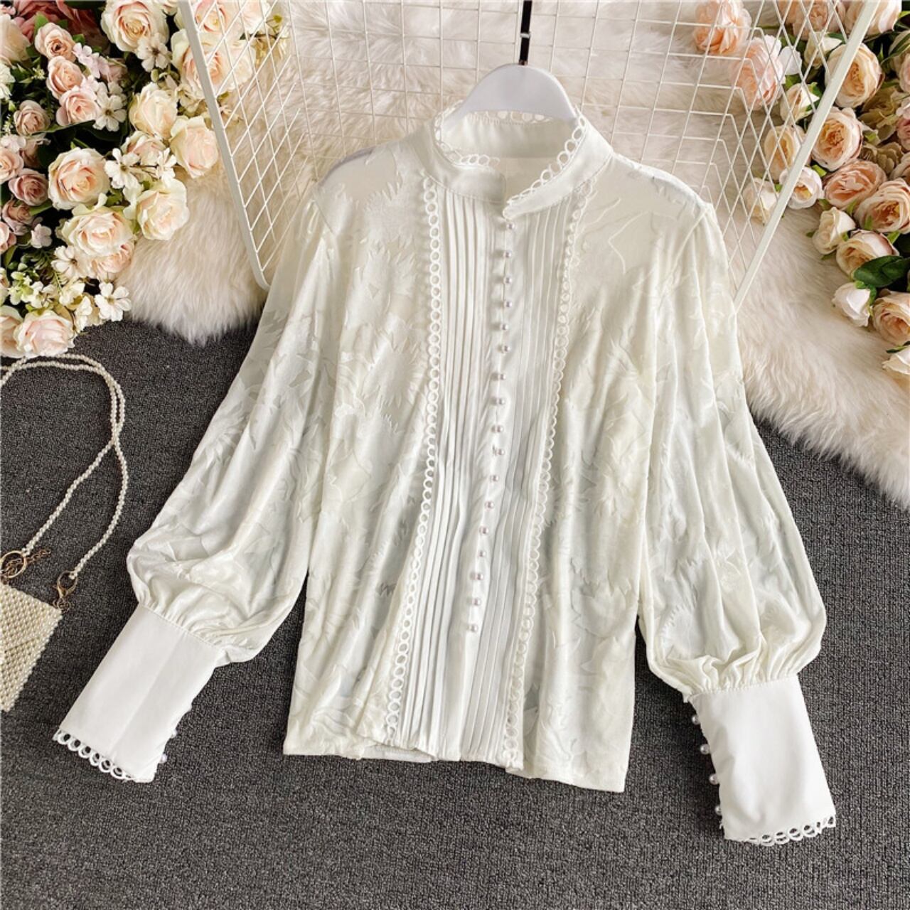 シャツ レディース トップス ブラウス スタンドカラー ベロア ベルベット 花柄 シースルー パールボタン 長袖 ボリューム袖 大人女子 クール かっこいい 上品 クラシカル シック エレガント フォーマル オシャレ 大人可愛い きれいめ ワンサイズ 2カラー ベーシックカラー 学生 OL ママ ミセス オフィス ビジネス デート 食事会 結婚式 披露宴 二次会 謝恩会 セレモニー 入学式 卒業式 オケージョン パーティー 着回し 普段使い ファッション コーデ スタイル おすすめ 人気 モテ デザイン
