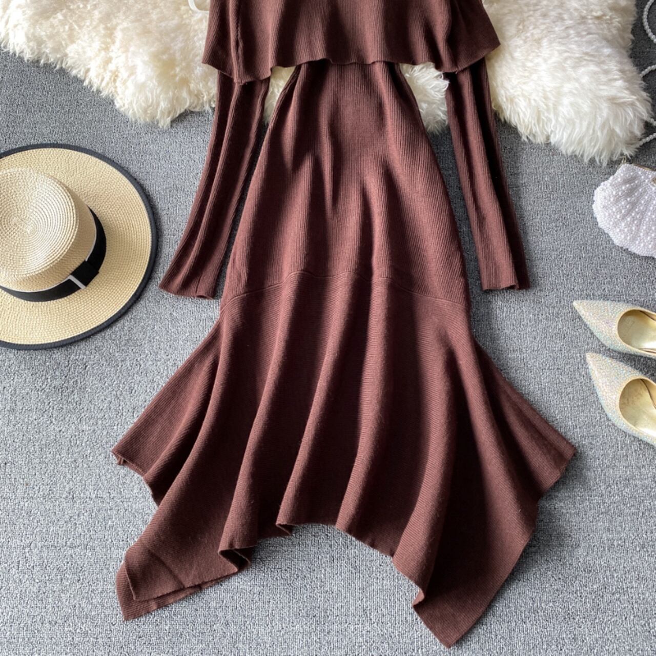 ワンピース Aライン 裾フレア アシンメトリー 膝丈 大人女子 レディース ニットワンピ オフショルダー ウエスト切替 ハイウエスト 長袖 上品 オシャレ 大人可愛い かわいい きれいめ シンプル カジュアル ラフ こなれ感 シンプル ワンサイズ 5カラー カラー豊富 無地 秋 冬 学生 OL ママ ミセス 通学 通勤 公園 デート お出かけ イベント ホームパーティー 旅行 着回し 普段使い 韓国系 ファッション スタイルアップ 体型カバー 簡単コーデ 楽ちん モテ おすすめ プチプラ 人気 デザイン