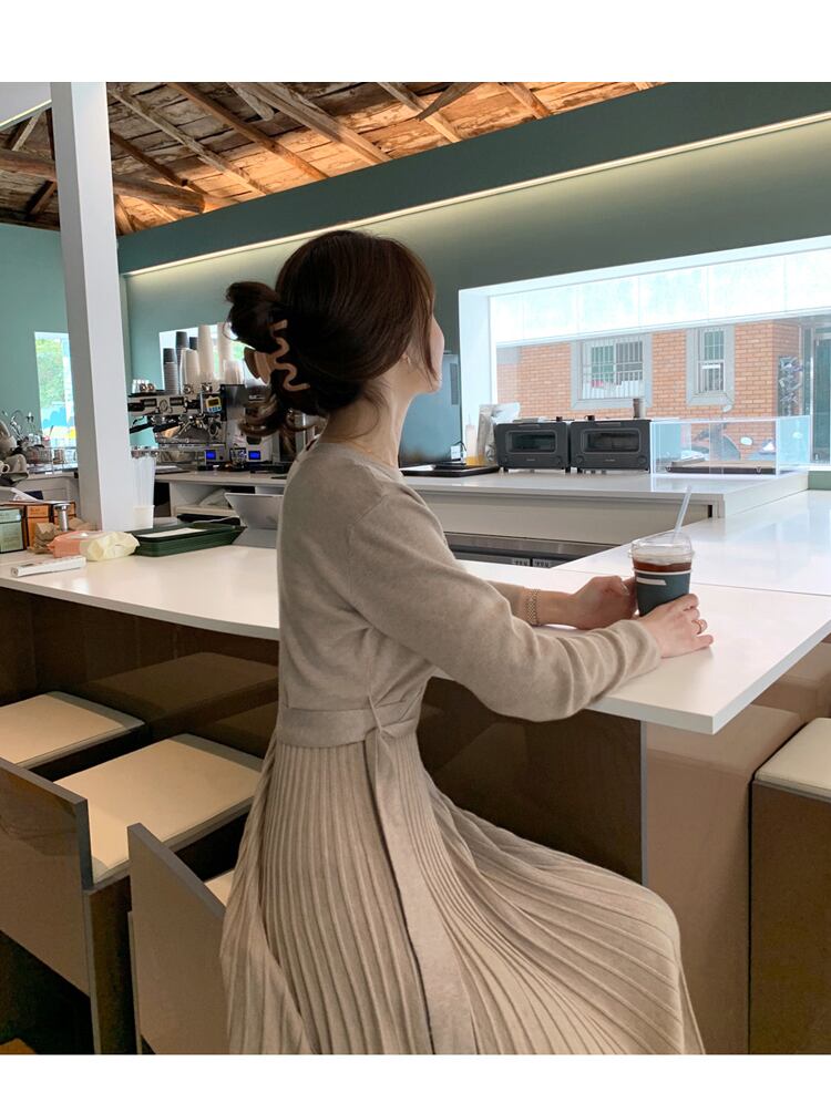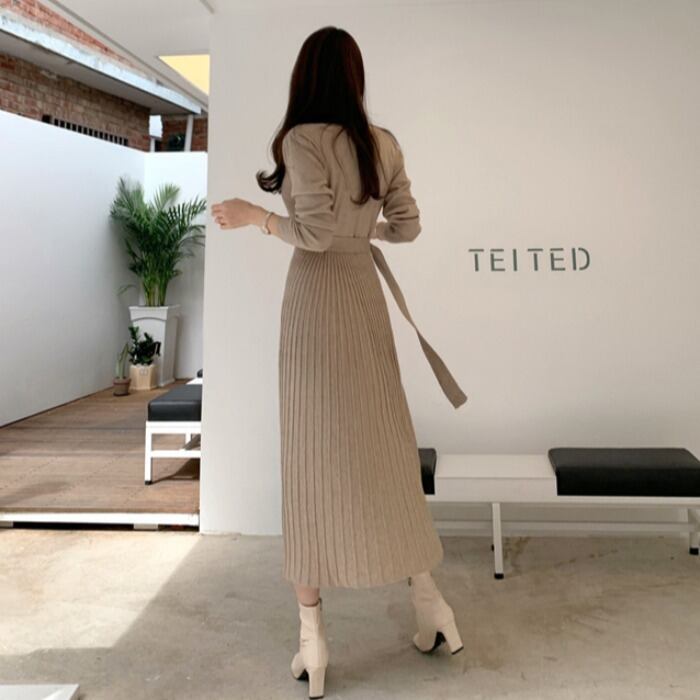 ニットワンピ レディース ロングスカート 長袖 プリーツスカート 共布ベルト くるみボタン Vネック 前開き 無地 単色 マキシ丈 くるぶし丈 ベージュ 黒 ブラック アプリコット パステルカラー ナチュラルカラー かわいい 大人可愛い 大人 大人女子 きれいめ おしゃれ お洒落 上品 キュート 20代 30代 40代 通勤 学生 通学 デート お出かけ 女子会 休日 イベント 普段使い 落ち感 こなれ感 端正 抜け感 ゆる エレガント パーティー モテ 着回し リゾート 韓国ファッション インポート