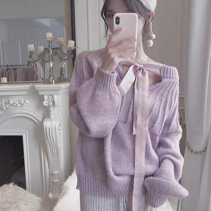 セーター レディース 長袖 2WAY 春秋 襟リボン 背中リボン 伸縮性 かわいい 大人可愛い きれいめ シンプル フェミニン 大人 上品 おしゃれ お洒落 リラックス ゆったりサイズ 大人女子 とろみ感 スタンドカラー リブ袖 袖あり 紫 パープル くすみカラー パステルカラー シャーベットカラー パフスリーブ 10代 20代 30代 女の子 着回し 普段使い 韓国 韓国系 オルチャン ファッション モテ 新作 定番 プチプラ トレンド 流行 インスタ映え オーバーサイズ モヘア 着まわせる インポート