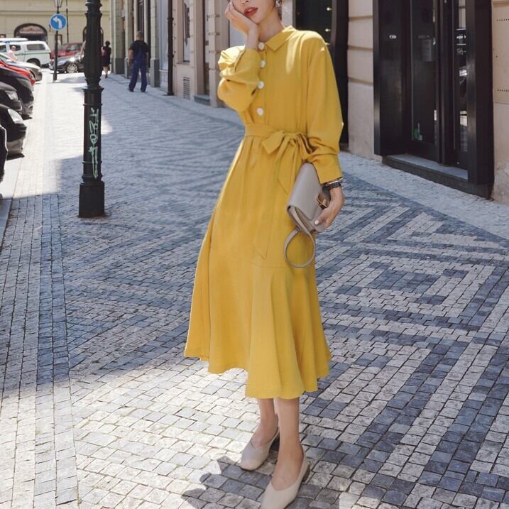 ワンピース ドレスワンピース ワンピ ブラック イエロー S M L カジュアル 普段着 普段使い 大人オシャレ 長袖 襟付 きかわいい おしゃれ 大人女子 オシャレ オトナモード クール スタイリッシュ インポート プチプラ ランキング お出かけ ディナー デート メンズライク インポート プチプラ 外国ファッション オルチャン 韓国デザイン ファッショナブル 海外デザイン プラスサイズ 女性 レディースファッション レディース 婦人服 おしゃれ女子フィッシュテールスカート ボトミング シャツワンピース