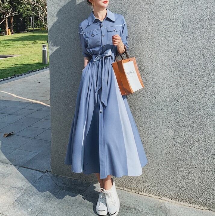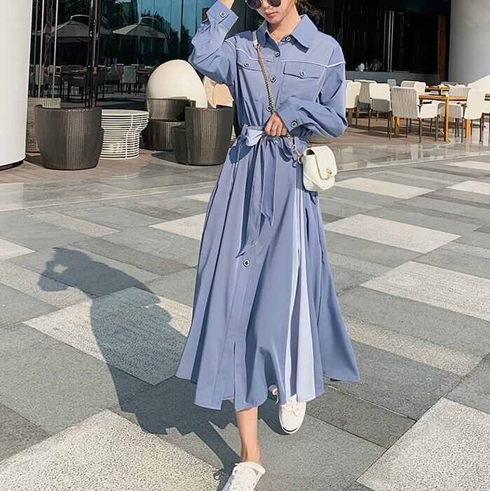 ワンピース ウエストリボン リボンベルト M L XL 2XL 3XL 4XL ブルー 長袖 ロングスリーブ 秋冬トレンド トレンディ シンプル 秋冬ワンピース 新作 レトロデザイン1 0代 20代 30代 お出かけ 旅行 カジュアル 飲み会 同窓会 女子会 デート ドライブ リゾート かわいい おしゃれ トレンディ 流行 レディースファッション レディース 婦人服 おしゃれ女子 切り替えしデザイン フロントポケット ファッション 海外 ファッショナブル シャツ風ワンピース こなれ感 素敵 人気 映える