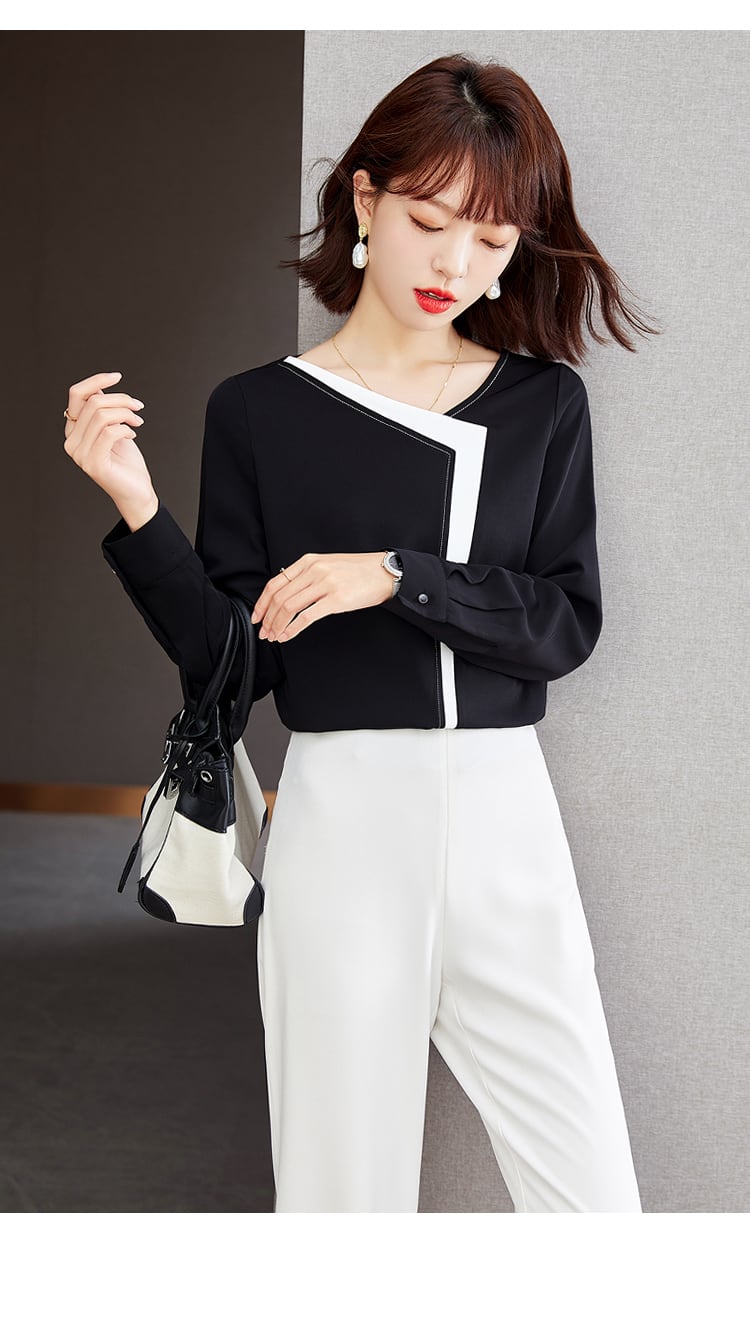 レディース 長袖ブラウス ブラック 襟なし 黒シャツ Vネック 配色ライン 白ライン入り プルオーバー 袖ボタン ラインパターン サイズ豊富 大人っぽい 大人 きちんと感 オフィス 通勤 テレワーク リモートワーク シャープ クール 上品 面談 プレゼン ジャケットインナー 買い物 20代 30代 40代 通学 ライン入りブラウス 婦人服 春秋 春服 秋服 おしゃれ トレンド モノトーン 着まわせる スーツインナー 韓国ファッション インポート服 低価格 お買い得 スタイルアップ 視線効果 デザイン重視