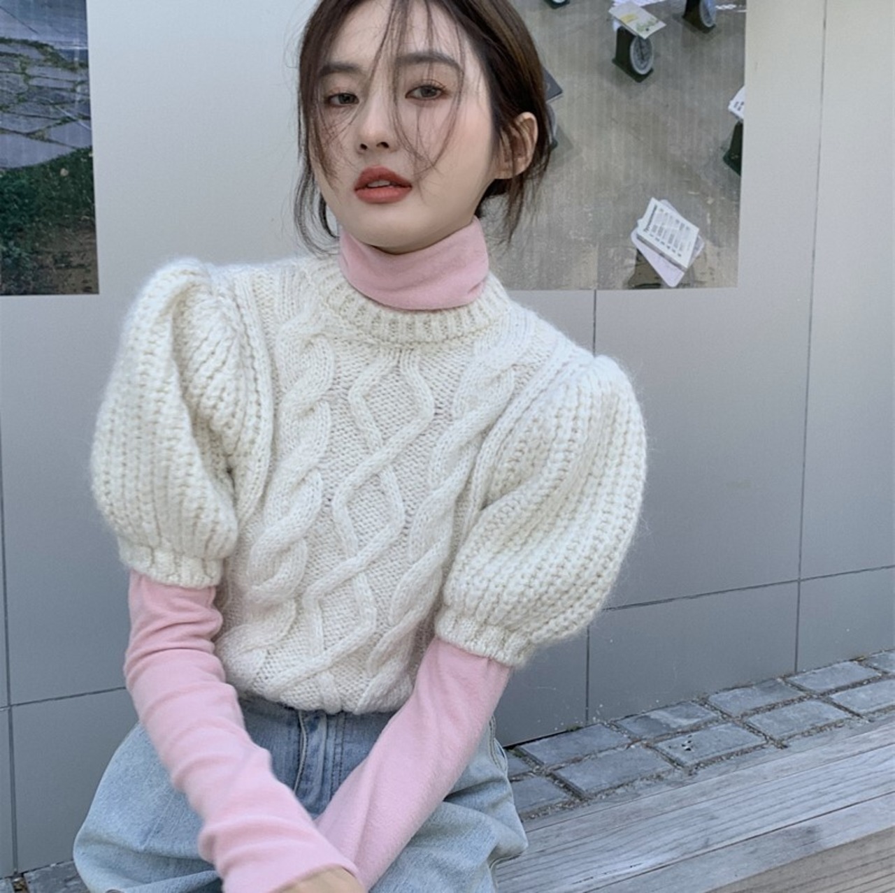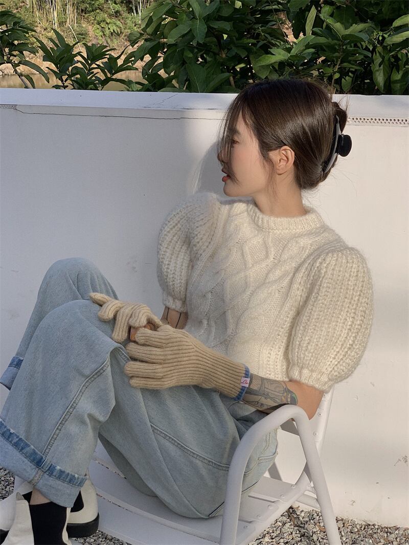 半袖セーター パフスリーブニット 長袖 アラン模様 ケーブル編み ホワイトセーター バルーン袖 パフスリーブ 短め丈 ラウンドネック ふわもこ 単色 かわいい 女の子っぽい ガーリー おしゃれ 春秋 モテ服 女子うけ ほっこり 柔らか素材 ナチュラル系 10代 20代 30代 激かわ 大人女子 大人可愛い かっこかわいい ワンサイズ ゆったり 着やすい プルオーバー 韓国ファッション へそ出し 着まわせる 定番柄 簡単コーデ 人気セーター インポート服 重ね着 低価格 値段重視 お買い得 好感度アップ