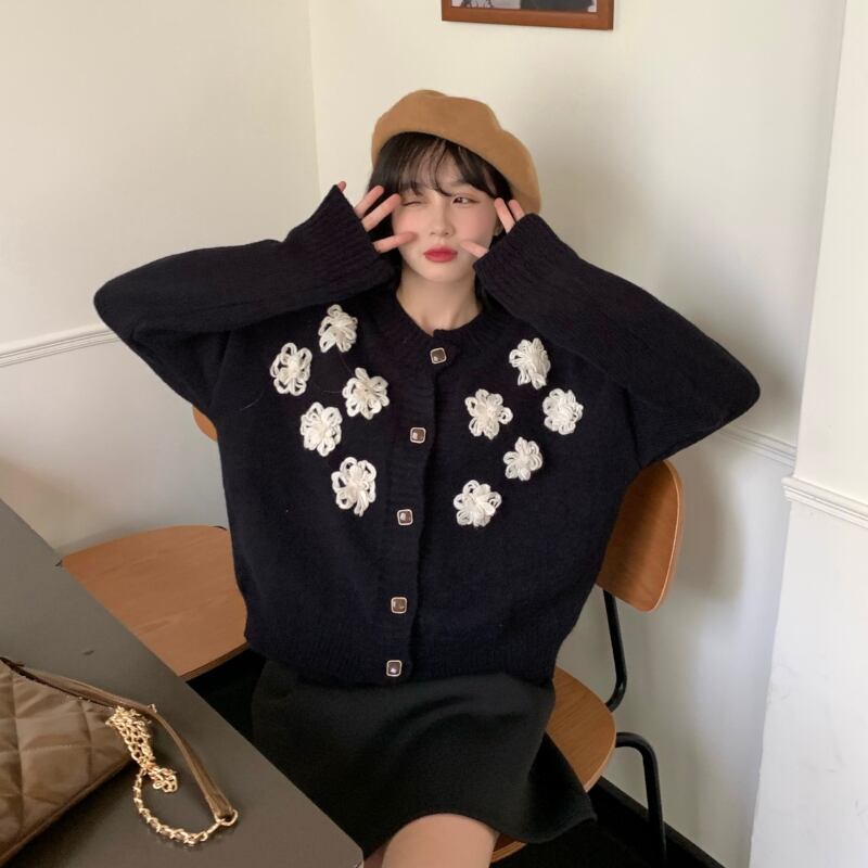 トップス レディース カーディガン セーター 袖あり 長袖 襟なし ボタン ボタンダウン 四角ボタン 前開き モノトーン 黒 ブラック かわいい 大人可愛い 大人 大人女子 きれいめ おしゃれ お洒落 シンプル ラブリー キュート ガーリー 10代 20代 30代 通勤 学生 通学 デート お出かけ 女子会 休日 イベント 普段使い カジュアル こなれ感 ラフ ルーズ 抜け感 個性的 レトロ ゆったり ゆる フローラル フラワー ボタニカル 秋 冬 防寒 暖かい あったか 楽ちん 着回し パーティー