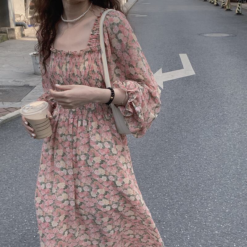花柄ワンピース フラワープリント 花柄 秋冬ワンピース ワンピ ロング丈 長袖 ロングスリーブ 秋冬ファッション M L XL ラブリー かわいい オシャレ ファッションセンス レトロデザイン 流行 人気 トレンド トレンディ シンプル シャーリング フリル 袖口フリル 収縮性 ゆるかわ ふんわり 女性らしさ レディースファッション レディース 婦人服 おしゃれワンピース プラスサイズ 女性 シフォンドレス ウエストスリミング スクエアネック フローラルスカート Aライン フレアースカート 秋冬物