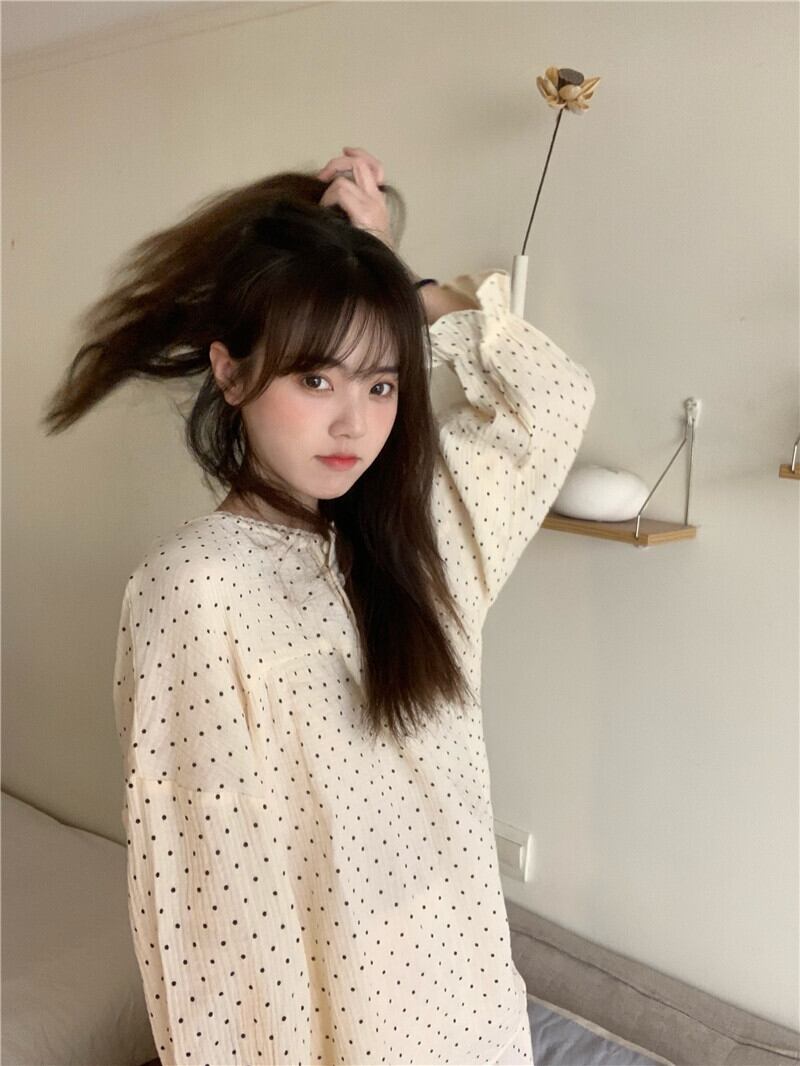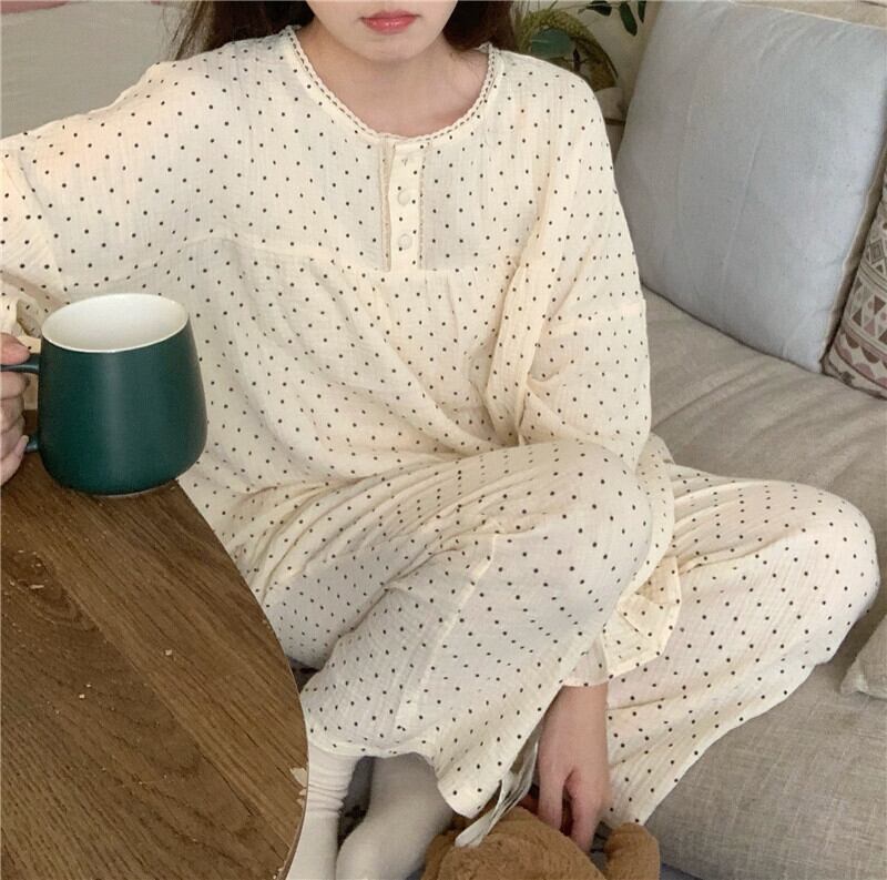 秋パジャマ 薄手 水玉 レディースナイトウエア 袖口ゴム入り ラウンドネック 上下セット プルオーバー ボタン付き 総柄 ドット柄 レース付き ブラウン系 ホワイト系 茶色 白 キャンディースリーブ パフスリーブ シンプルデザイン 優し気 ナチュラル 渋み系 トップス長め かわいい 大人可愛い エイジレス 10代 20代 30代 ゆったり リラクシング リラックス コンフォート 柔らか素材 部屋着 ルームウエア 韓国 韓国ファッション 低価格 値段重視 お買い得 お泊り 旅行 スパ 温泉 トラベル