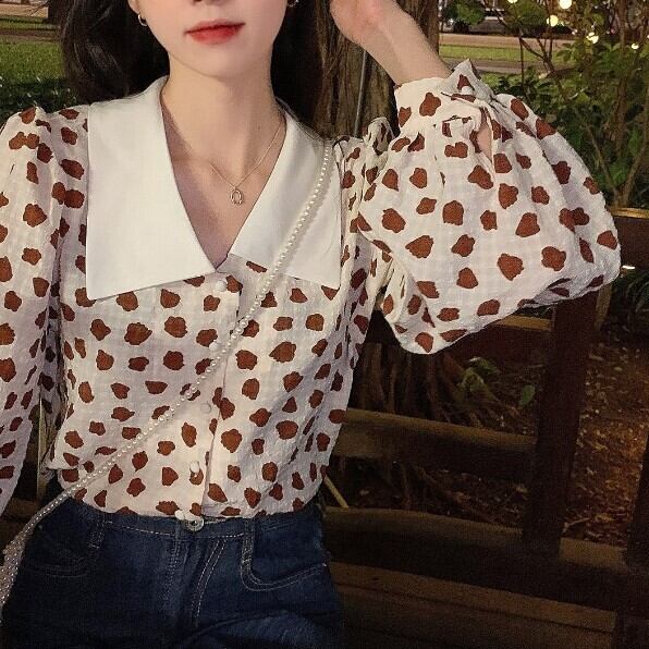初秋 ブラウス シャツ 水玉模様 ドット柄 秋冬トレンド トレンディ 新作 ブラウスシャツ ブラック ブラウン シック モダン オシャレ オトナモード クール スタイリッシュ 大人かわいい パフスリーブ 長袖 ロングスリーブ シャーリング シンプル Vネック フレンチシャツ レディース レディースファッション レディースブラウス 婦人服 おしゃれ女子 初秋 新デザイン センス スウィート シックブラウス 長袖シャツ ワンサイズ オルチャンスタイル 韓国デザイン 秋冬ファッション 10代 20代 30代