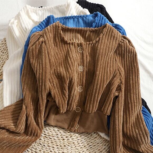 ショート丈 カーデガン トップス トップ コーデュロイ シャツ パフスリーブ 長袖 ロングスリーブ シャーリング フロントボタン 秋冬トレンド トレンディ 流行 レディースファッション カジュアル 普段着 普段使い 着回し 重ね着 かわいい お勧め トレンド レトロデザイン 今風 お出かけ デート 通勤 学生 10代 20代 30代 韓国デザイン オルチャン 海外ファッション プチプラ ランキング キュート お勧め ワンサイズ 秋冬ファッション ホワイト ブラック ブラウン ピンク ブルー 新作 無地