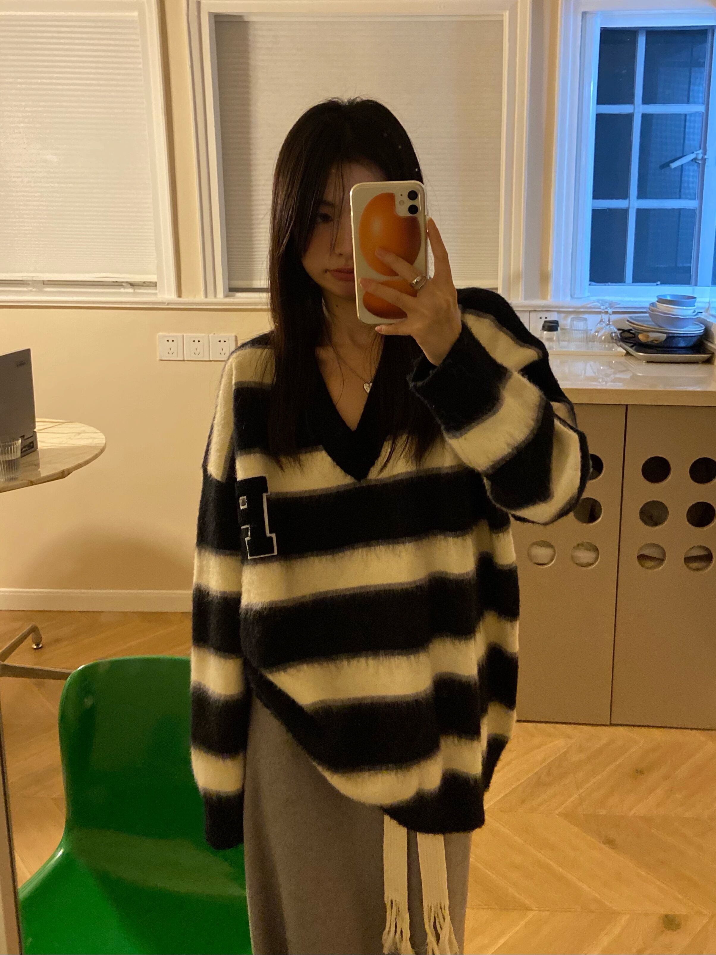 Vネックセータートップス ボーダー しましま 白黒 モノトーン ゆる 長袖 シャギー 太めボーダー プレッピー 白系 カジュアル ストリート オーバーサイズ ゆったりサイズ アメカジ かっこかわいい フワモコ ツートンカラー 柔らか素材 暖か 秋冬 春秋 ゆったり リラックス コンフォート 女の子っぽい 通学 学生 旅行 スパ トラベル ランチ デート 部屋着 ルームウエア ワンマイルスタイル 女子人気 韓国 韓国ファッション インポート 低価格 お買い得 人気 好感度アップ 着まわせる 10代 20代