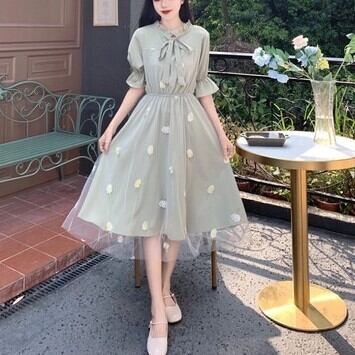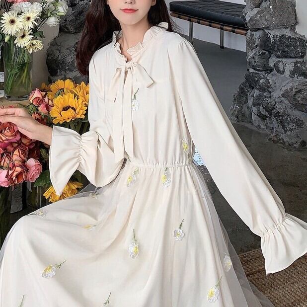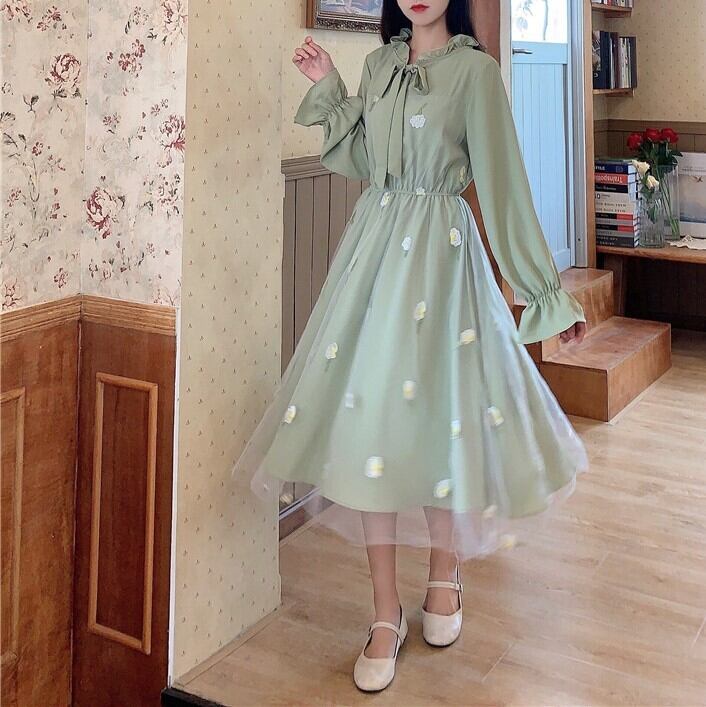 ワンピース ワンピ 秋冬ワンピース 女子 トレンド 秋冬トレンド トレンディ 流行 レディースファッション レトロデザイン 韓国デザイン オルチャン 海外ファッション プチプラ 半袖 長袖 花柄刺繍 フラワー刺繡 シースルー パフスリーブ リボンネクタイ グリーン アプリコット 大人綺麗10代 20代 30代 買い物 カジュアル オシャレクール 大人女子 妖精 新しい 学生 スカートドレス パーティー お呼ばれ 二次会 飲み会 合コン 女子会 モテ メンズライク 素敵 大人可愛い ミディアム丈 モダン