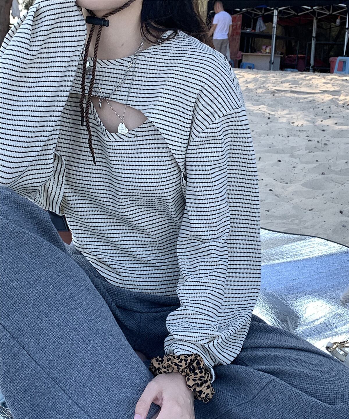アンサンブル ボーダー柄 レディース ピンストライプ 長袖 タンクトップ プルオーバー ラウンドネック フロントオープン 裾アシンメトリー スリット入り 2枚セット ユニークデザイン 可愛い おしゃれ トレンド 人気 女子人気 大人女子 デザインシャツ 春秋 カジュアル ラフスタイル ナチュラル オフホワイト くすみカラー 袖長め リブ袖 ワンマイルスタイル かわいい かっこかわいい スタイリッシュ 着やすい 着まわせる 襟ボア 韓国ファッション 10代 20代 30代 簡単コーデ 低価格 オルチャン