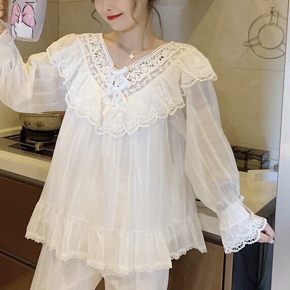 トレンドパジャマ 上下セット ツーピース ワンサイズ ホワイト レース 秋 冬 新作 フリル パフスリーブ 長袖 ロングスリーブ シャーリング 可愛らしい 大人女子 オシャレ オトナモード クール スタイリッシュ 秋冬パジャマ トップス パンツ 長ズボン 長袖 お部屋時間 寝具 寝間着 お家時間 リラックス ルームウェア ナイトウェア パジャマパーティー お泊り 旅行 外泊 10代 20代 30代 ラグジュアリー 気品 清楚 おしゃれパジャマ 新しい セクシー プリンセススタイル 襟付き 大人ぱじゃま 白