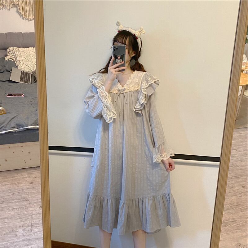 ルームウェア レディース ワンピース 部屋着 寝巻き ナイトウェア ネグリジェ ロングスカート ロング丈 ロング丈 袖あり 長袖 ウイングショルダー Vネック 襟なし ギャザー レース フリル リボン ストライプ 灰色 グレー かわいい 大人可愛い 大人 大人女子 きれいめ おしゃれ お洒落 シンプル ラブリー キュート ガーリー 10代 20代 30代 学生 デート 女子会 休日 イベント 普段使い ワイド ストレート カジュアル こなれ感 ラフ ルーズ 抜け感 ゆったり ゆる お泊まり 楽ちん