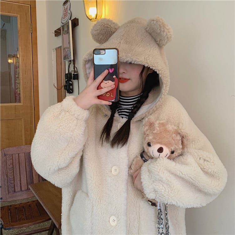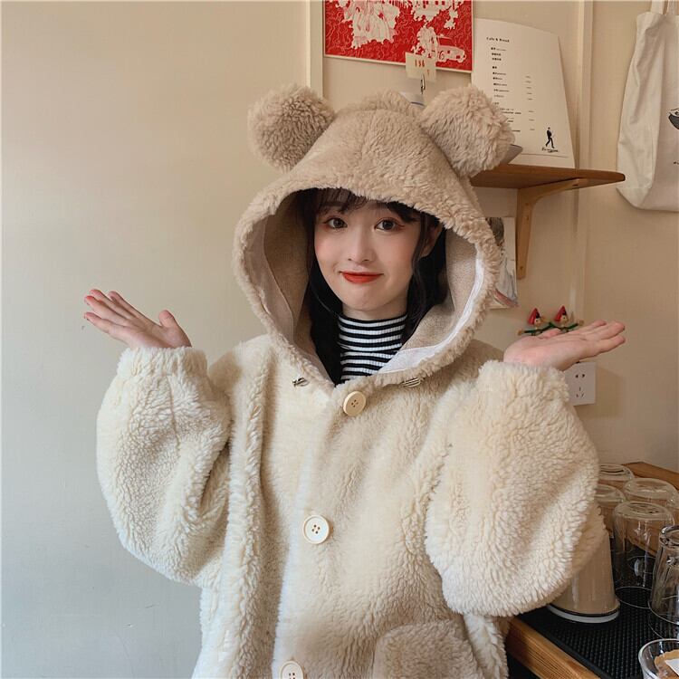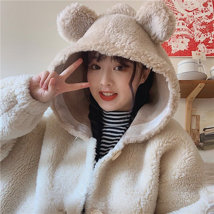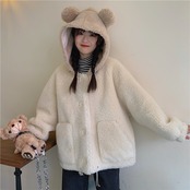 クマ耳フード ジャケット コート レディース アニマルモチーフ ハーフコート ふわもこ 前開き 前ポケット 前ボタン 無地 単色 グラデーション クリーム系 ホワイト系 動物好き クマ耳 ゆったり ふんわり かわいい 乙女系 女の子っぽい 防寒着 冬物 冬支度 冬アウター ほっこり系 ゆるかわ カジュアル デート 通学 お買い物 子供うけ 家族シェア ナチュラル系 旅行 アウトドア 韓国服 韓国ファッション 海外 低価格 お買い得 韓国系 女子うけ 女子人気 低予算 秋冬 おしゃれ トレンド 羽織り物