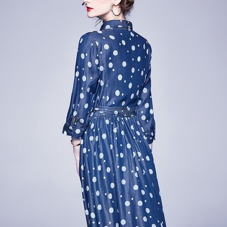 デニムワンピース 水玉ワンピース ドット柄ワンピ ロング丈 長袖 ロングスリーブ 秋冬ファッション デニム素材 ウエストリボンベルト フレアースカートドレス フロントボタン おしゃれワンピース トレンド トレンディ 流行 秋冬ワンピース ヨーロッパスタイル 外国デザイン 女性ドレス ウエストスリミング デニムスカート 七分袖 水玉 フレンチドレス 海外ファッションフェミニン お出かけ お呼ばれ パーティー 飲み会 二次会 発表会 人気ワンピース デート オシャレ かわいい 大人かわいい 大人クール モテ