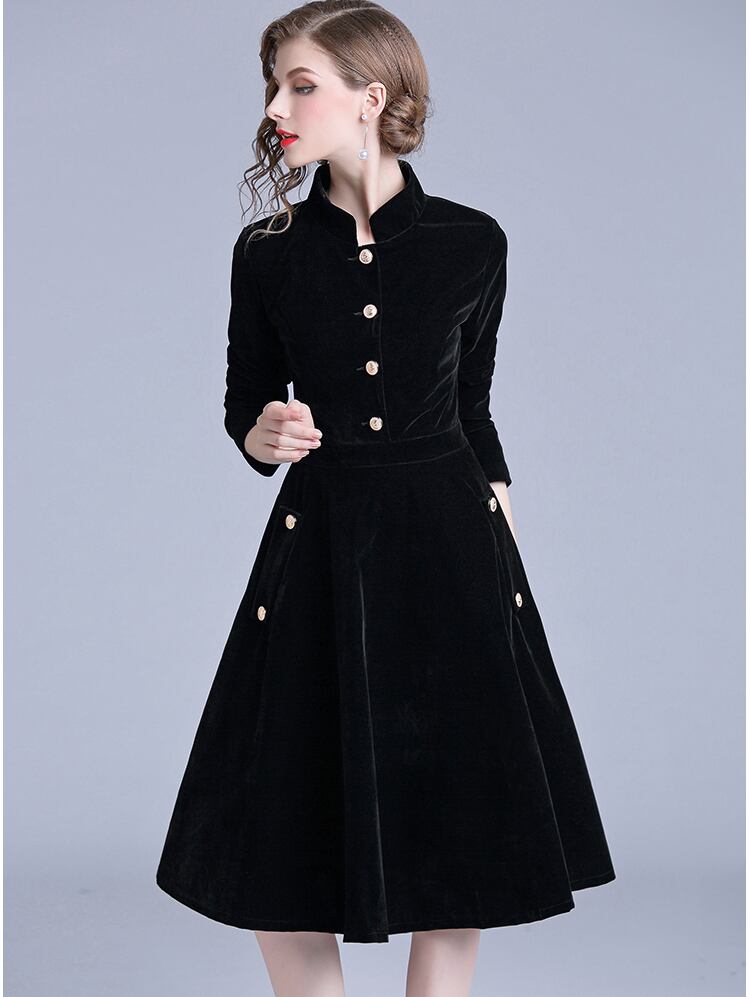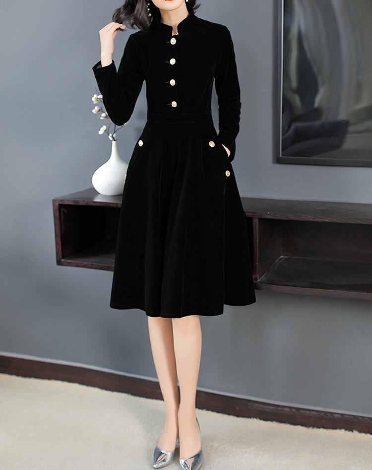 ワンピース レディース フレアスカート 膝丈 ひざ丈 袖あり 長袖 襟付き スタンドカラー マオカラー ファスナー ポケット ボタン 金ボタン ボタンダウン 前開き Aライン 光沢 黒 ブラック かわいい 大人可愛い 大人 大人女子 きれいめ おしゃれ お洒落 シンプル ラブリー キュート ガーリー 10代 20代 30代 通勤 学生 通学 デート お出かけ 女子会 休日 イベント 普段使い カジュアル こなれ感 抜け感 上品 エレガント セクシー フォーマル 結婚式 二次会 披露宴 パーティー モテ