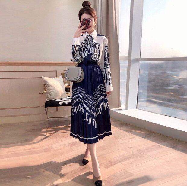 ワンピース レディース ワンピドレス プリント ロゴ モノグラム ボタン リボンタイ 文字 プリーツスカート アコーディオンプリーツ ロングスカート ロング丈 ロング 袖あり 長袖 襟付き スタンダードカラー 切り替えデザイン ウエストマーク リボン 紺 ブルー かわいい 大人可愛い 大人 大人女子 きれいめ おしゃれ お洒落 個性的 モード系 20代 30代 学生 デート お出かけ 女子会 休日 イベント こなれ感 抜け感 上品 エレガント セクシー フォーマル 結婚式 二次会 披露宴 パーティー