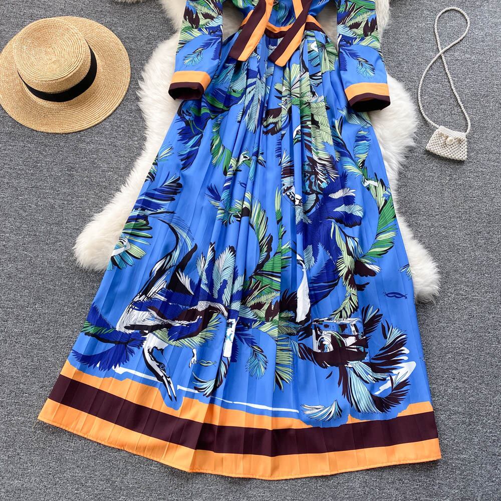 ワンピースドレス 秋冬ワンピース 新作ワンピース ワンピドレス カラフル ゴージャス ネックリボン リボンネクタイ カジュアルワンピース お呼ばれ 普段使い こなれ感 ストリート お出かけ デート ドライブ 旅行 二次会 披露宴 発表会 かっこいい 大人女子 ブルー S M L XL ヨーロッパスタイル エレガント プリント レディース ロングスカート ネックライン フレンチレトロ Aラインドレス 10代 20代 30代 40代 OL ママ 学生 リゾート 大人綺麗 フレアースカート 新鮮 トレンド