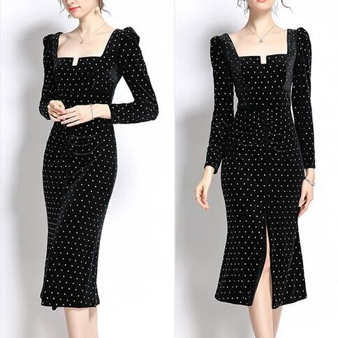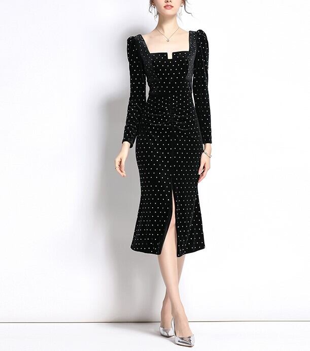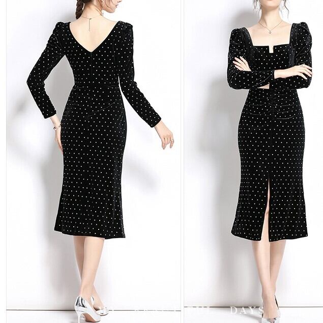水玉ワンピース ドット柄ワンピースドレス ブラックワンピース ブラックドレス ベルベットワンピース パフスリーブワンピース パーティードレス ナイトドレス カクテルドレス トレンド トレンディ シンプル 流行 レトロデザイン 長袖 秋冬ワンピース 大人クールデザイン シック モダン パーティー イベント 披露宴 ウエディング 発表会 OL ママ 20代 30代 40代 シンプル きれいめ こなれ感 カジュアルワンピース タイト フィット スリット セクシー 美脚 ベットドレス ハイウエスト スリム