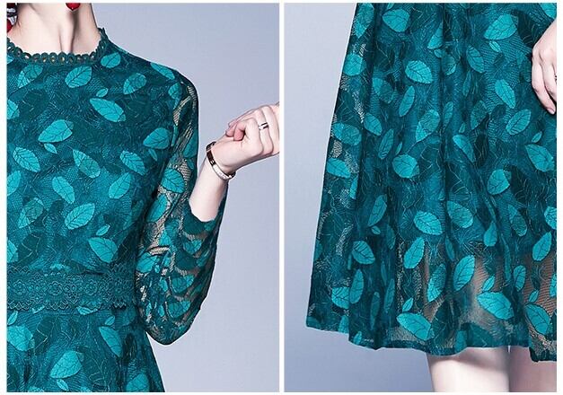 レースワンピース 長袖 リーフ柄 レディース ミモレ丈 フレアスカート ラウンドネック フープレース ターコイズブルー ブルー系 グリーン系 単色 レーシー 透け感 合わせ柄 総柄 艶感 シアー レトロモダン レトロシック ピーコックカラー レトロ感 クラシカル 大人 大人可愛い 上品 フェミニン 清楚 清潔感 お呼ばれ 披露宴 ウエディング お食事 デート プレゼント 通勤 同窓会 女子会 パーティー ホームパーティー 韓国 韓国ファッション お買い得 低価格 後ろファスナー 着やすい ふんわりスカート