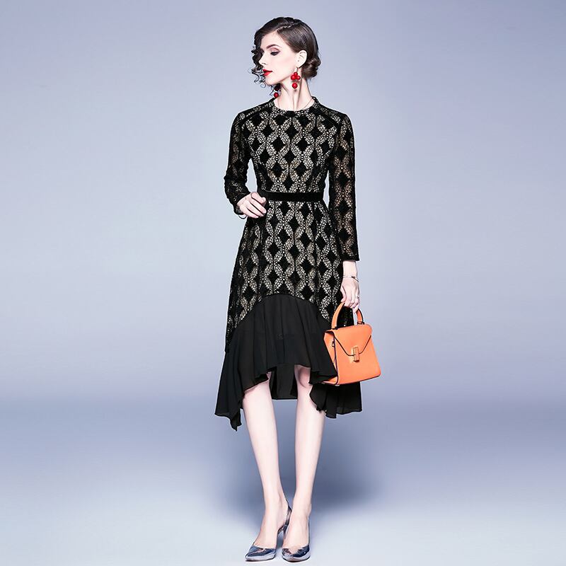 黒レースワンピース 長袖 レディース 後ろファスナー イレヘム フィッシュテール ふんわりスカート 幾何学模様 ダイヤ柄 ラウンドネック ウエストマーク 秋冬 通勤 お食事 お呼ばれ 懇談会 リモートワーク レーシー 大人っぽい フェミニン モノトーン 綺麗め 上品 エレガント おしゃれ 披露宴 大人女子 20代 30代 40代 サイズ豊富 着やせ効果 総柄 シック 韓国ファッション 低価格 お買い得 トレンド インポート プチプラ 着やすい S M 2XL ハイウエスト 脚長効果 クールフェミニン