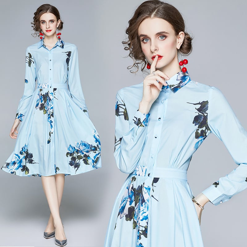 ブループリントワンピ シャツワンピ レディース 長袖 花柄 ミモレ丈 レギュラーカラー 前ボタン 前開き レトロモダン バラ ウエストマーク 青系 ブルー アンティーク調 クラシカル 上品 清楚 かわいい おしゃれ 大人女子 レトロ感 爽やか 秋冬 オフィススタイル 通勤 通学 お呼ばれ お食事 ランチ リモートワーク デート 大人っぽい きちんと感 清潔感 トレンド フラワーモチーフ 着まわせる 韓国服 韓国ファッション インポート服 低価格 お買い得 サイズ豊富 20代 30代 40代 2XL