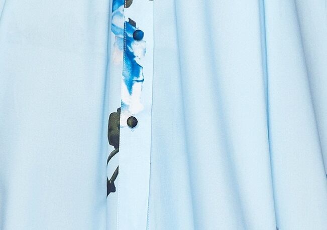 爽やかなブルーで同系色の柄なのでうるさくならず、落ち着いて上品な装いに。