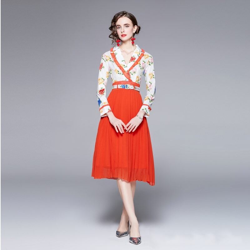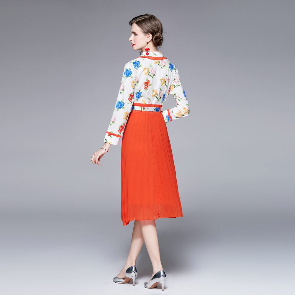 ワンピース レディース フェイクワンピ プリーツスカート アコーディオンプリーツ ノッチドラペルカラー ミモレ丈 ミモレ 袖あり 長袖 襟付き 切り替えデザイン ドッキング シフォン ウエストマーク ベルト オレンジ フローラル 花柄 フラワー ボタニカル かわいい 大人可愛い 大人 大人女子 きれいめ おしゃれ お洒落 シンプル ラブリー キュート ガーリー 10代 20代 30代 通勤 学生 通学 デート お出かけ 女子会 休日 イベント 普段使い カジュアル 抜け感 上品 エレガント パーティー