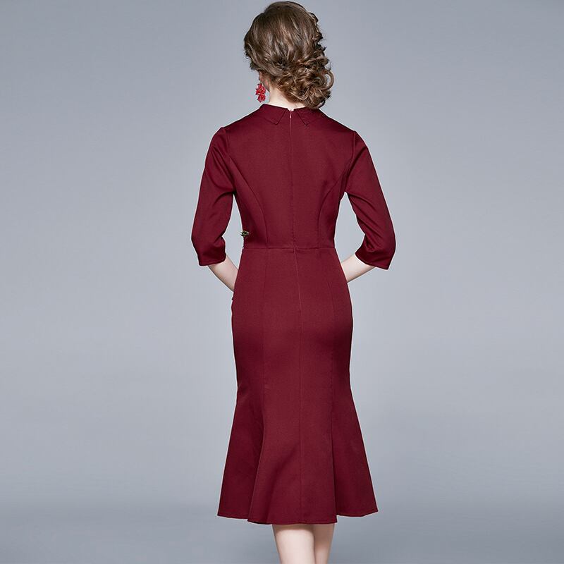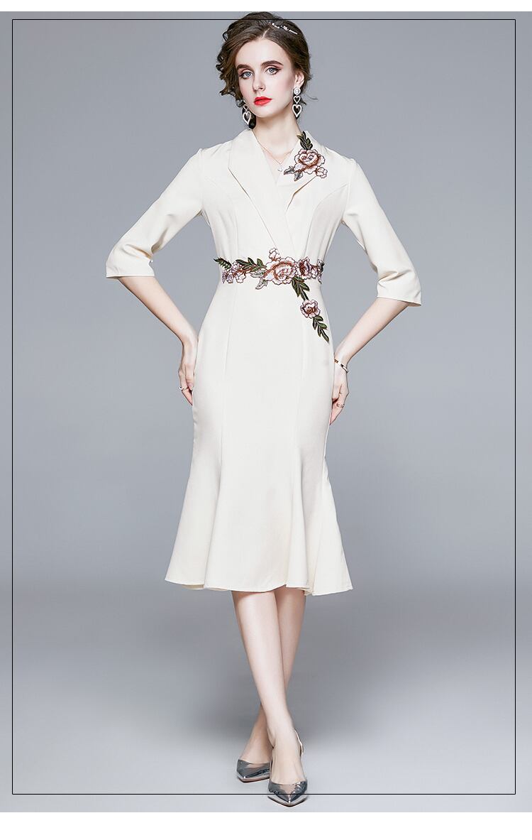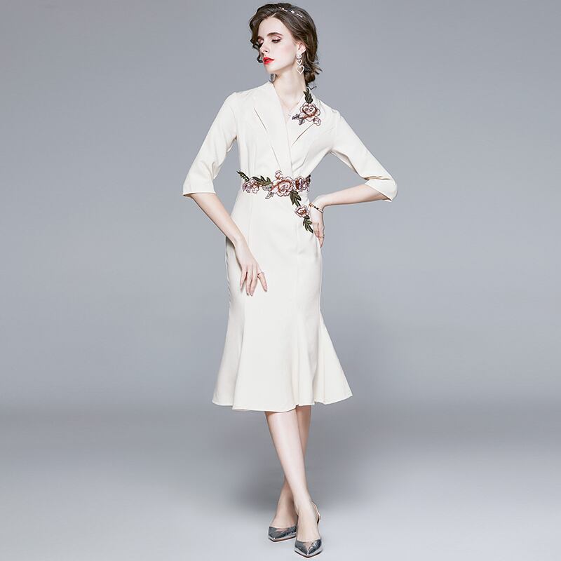 7分袖ワンピース レディース ショールカラー 花柄刺繍 アップリケ ウエスト刺繍 マーメイドスカート ハイウエスト ヘチマカラー フラワーアップリケ ワンポイント 花柄ベルト ウエストマーク 後ろファスナー レトロ感 クラシカル 上品 レトロモダン ひざ丈 タイトスカート 女っぽい 大人女子 大人っぽい エレガント フォーマル 清楚 パーティードレス ホームパーティー お呼ばれ ウエディング 披露宴 お食事 リモートワーク 大人 20代 30代 40代 きちんと感 韓国ファッション 低価格 お買い得