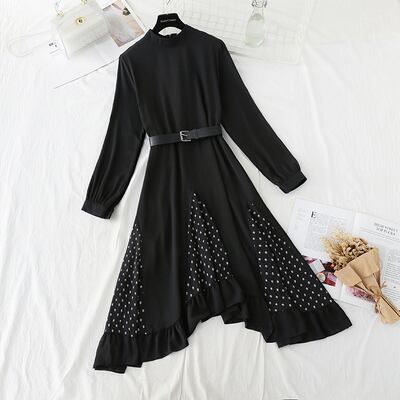 ワンピース レディース Aラインワンピース ミモレ丈 長袖 柄 ドット 水玉 春 秋 セミフレア スリム Aライン 裾フレア シフォン かわいい 大人可愛い きれいめ シンプル カジュアル 大人 上品 おしゃれ お洒落 大人可愛い 大人女子 個性的 モード系 クルーネック ミモレ 袖あり 黒 ブラック 大人カラー ベイクドカラー S M L XL 20代 30代 デート 女子会 休日 パーティー イベント 着回し 普段使い 韓国 韓国系 コーデ スタイル モテ 新作 トレンド 流行 インスタ映え