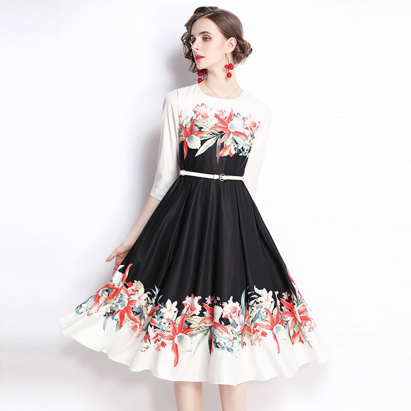 ワンピース フローラル 花柄 フラワー ボタニカル フレアスカート ひざ丈 膝丈 袖あり 7分袖 七分袖 Uネック ラウンドネック 襟なし Aライン ベルト ウエストマーク 艶 つや 光沢 白 ホワイト 黒 ブラック かわいい 大人可愛い レディース 大人 大人女子 きれいめ おしゃれ お洒落 シンプル ラブリー キュート ガーリー 10代 20代 30代 通勤 学生 通学 デート お出かけ 女子会 休日 イベント 普段使い カジュアル こなれ感 抜け感 上品 エレガント 二次会 披露宴 パーティー