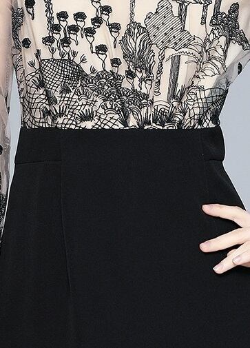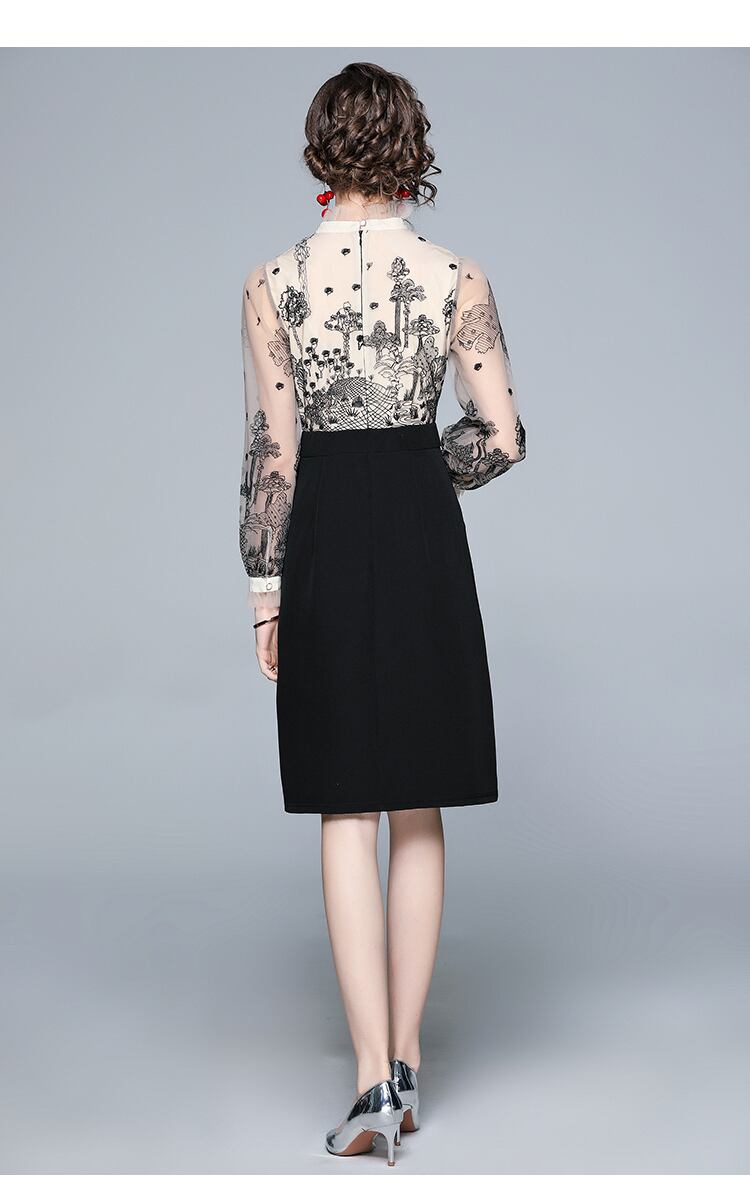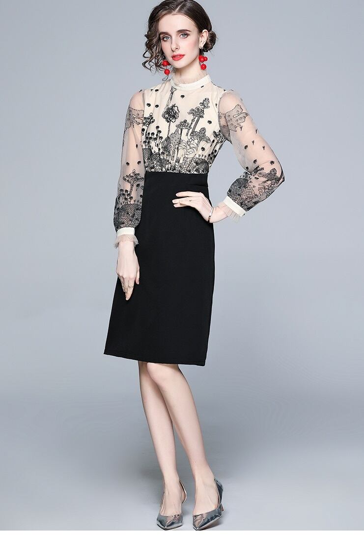 ドッキングワンピ ひざ丈タイトスカート レディース プチハイネック 長袖 シフォン刺繍 花柄 ボタニカル レース付き モノトーン 透け感 レーシー シアー 大人女子 フェミニン 袖刺繍 通勤 オフィススタイル 簡単コーデ 着まわせる リモートワーク お食事 ランチ 女子会 シンプルコーデ 懇談会 トレンド 上品 エレガント ミセス エレガントママ 清楚 秋冬 女っぽい 韓国 韓国ファッション 韓国服 お買い得 低価格 サイズ豊富 値段重視 S M 2XL レース使い ボトルネック コーデしやすい 低予算