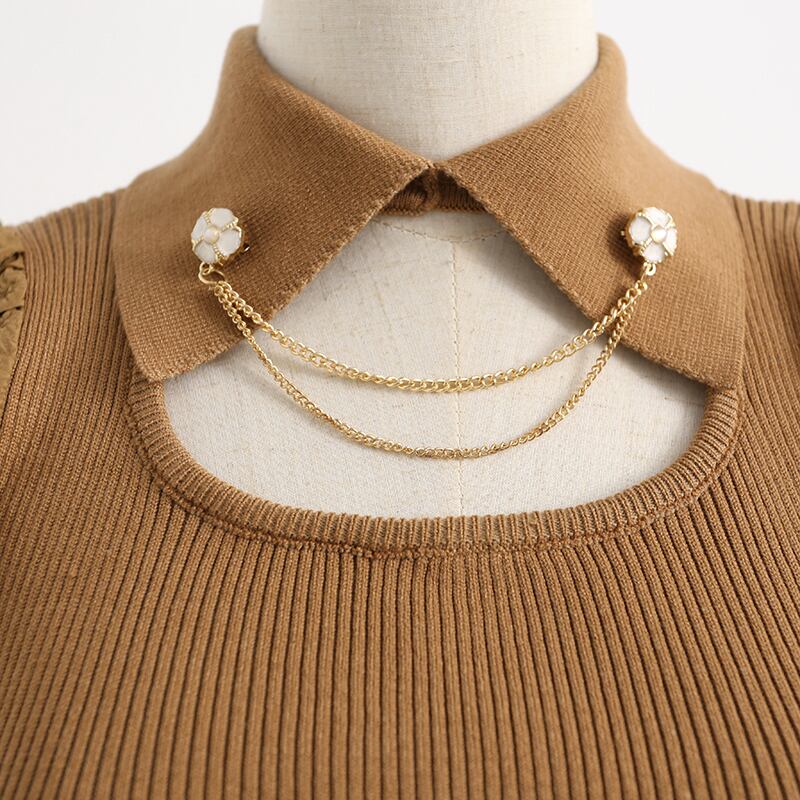 首元のゴールドチェーンがアクセント。