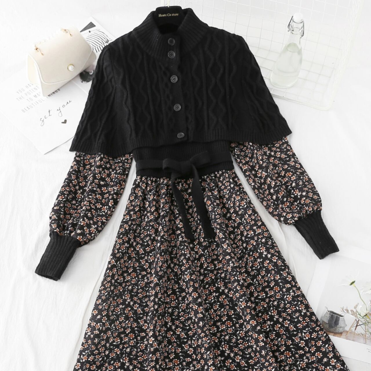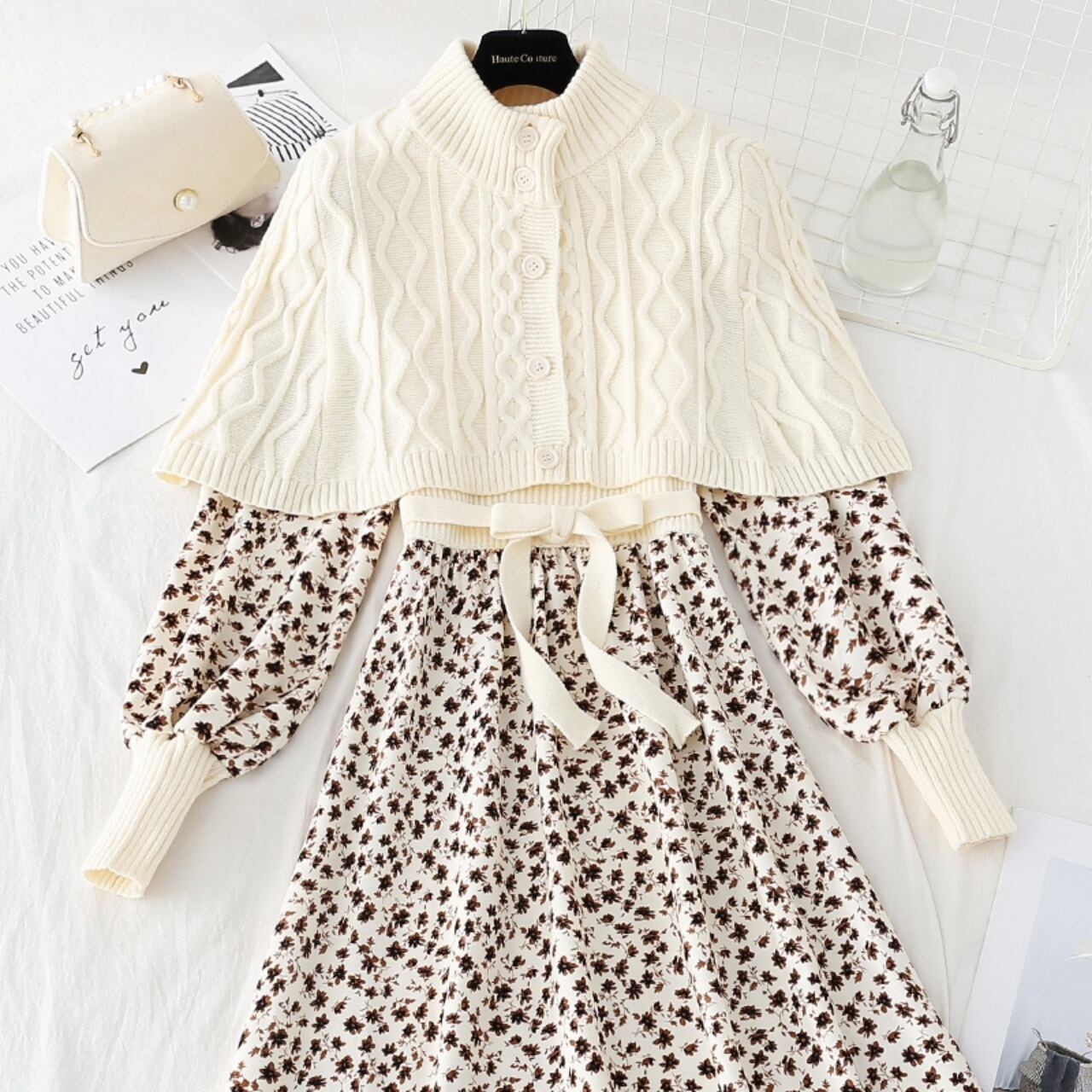 ワンピース レディース 2点セット 異素材 ベスト風 長袖 小花柄 ウエストマーク リボン Aライン 裾フレア ポンチョ ケーブル編み 大人可愛い かわいい きれいめ カジュアル ラフ こなれ感 オシャレ 4カラー 4サイズ 学生 通学 OL 休日 お出かけ デート ショッピング 映画館 女子会 食事会 イベント ホームパーティー 着回し 普段使い ファッション 簡単コーデ スタイルアップ 体型カバー 韓国系 海外ファッション インポート モテ トレンド 流行 おすすめ 人気 お得 プチプラ